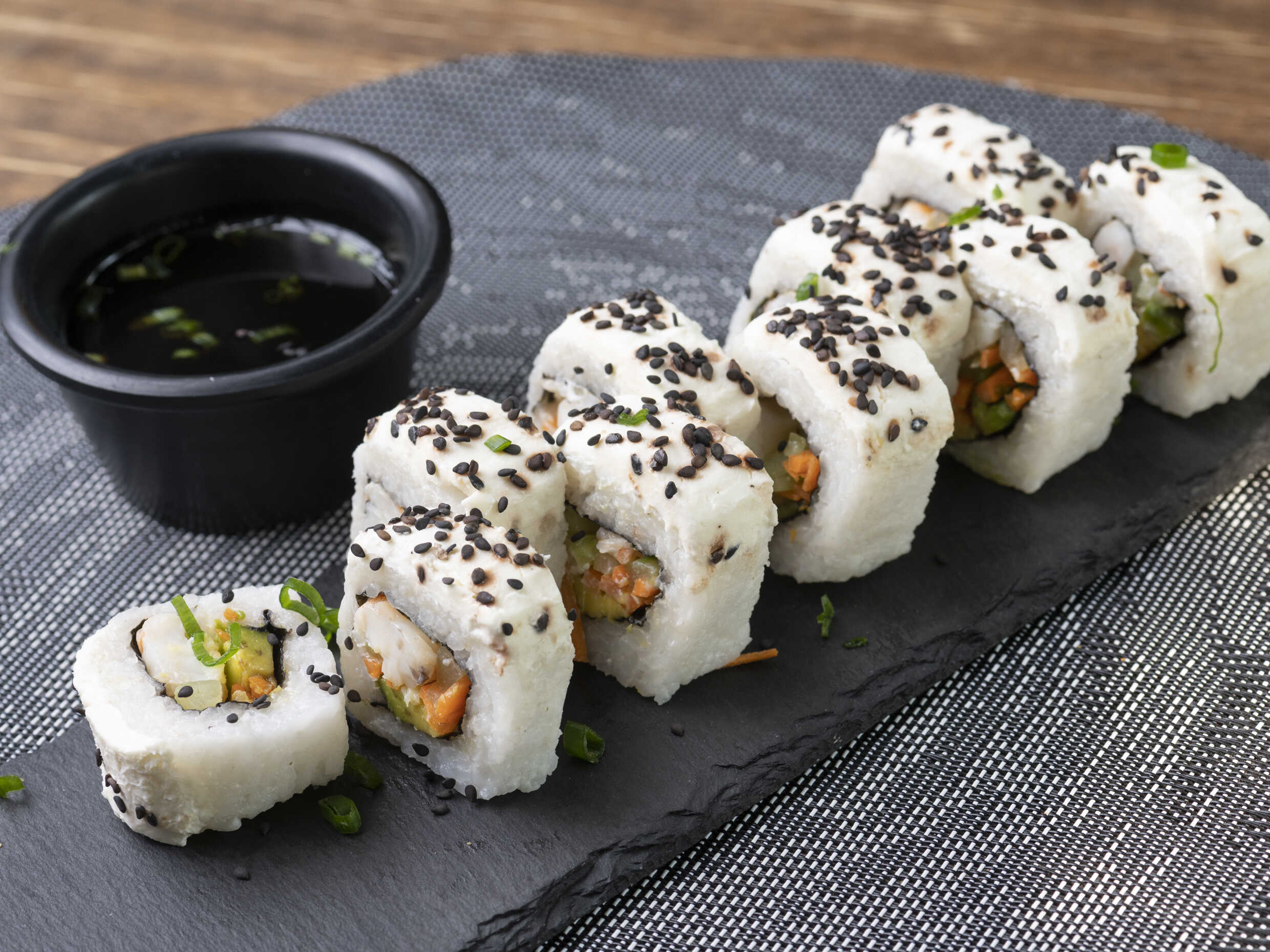 Sushi sin alga cubierto con aguacate.