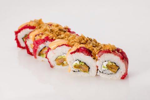 Arroz ebi especial con camarón empanizado, aguacate y phila por dentro, atún fresco por fuera sriracha mayo y cebollitas.