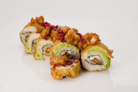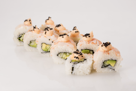 Camarón panko y phila, aguacate capeado por fuera y topping de camarones roca.