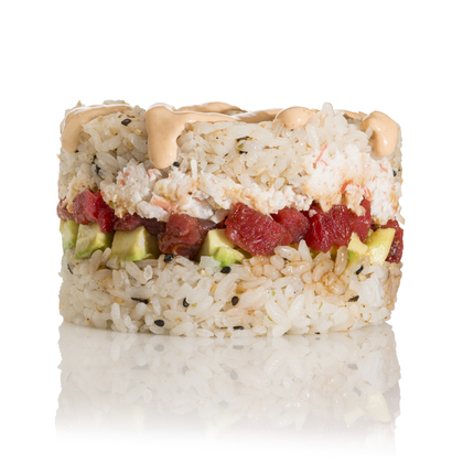 Sushi en torre, con arroz gohan ebi, aguacate, atún ginger glazed y tampico, aconmpañado con chipotle.