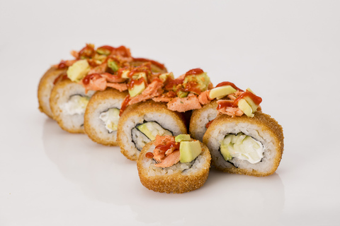 Rollo empanizado con philadelphia y pepino por dentro, coronado con trocitos de salmón spicy y aguacate.