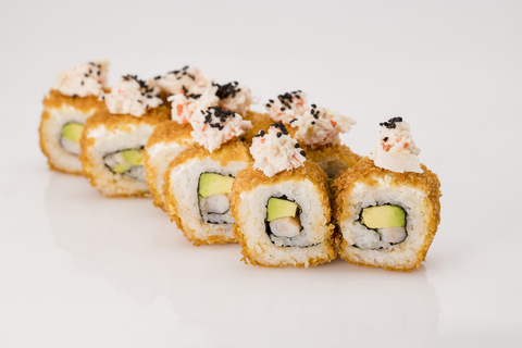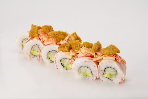 Empanizado con panko, aguacate, philadelphia y pepino por dentro, topping de camarón, kanikama y aderezo sriracha mayo.
