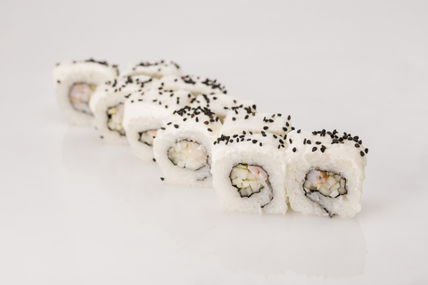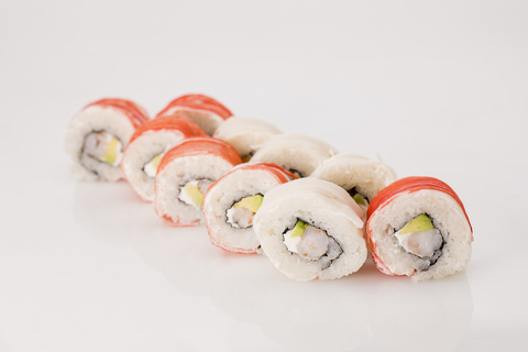 Pepino y aguacate por fuera, kanikama y philadelphia por fuera, topping de camarón empanizado y ensalada kani.