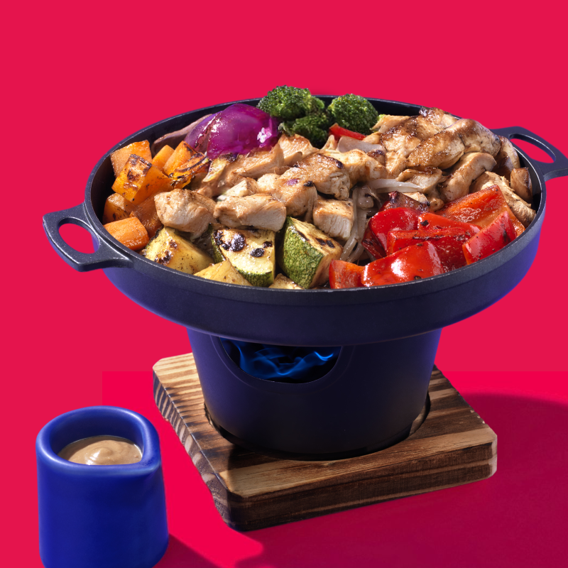 Mezcla de vegetales a la plancha con Pollo (150g). Acompañado de deliciosa salsa de Ajonjolí.