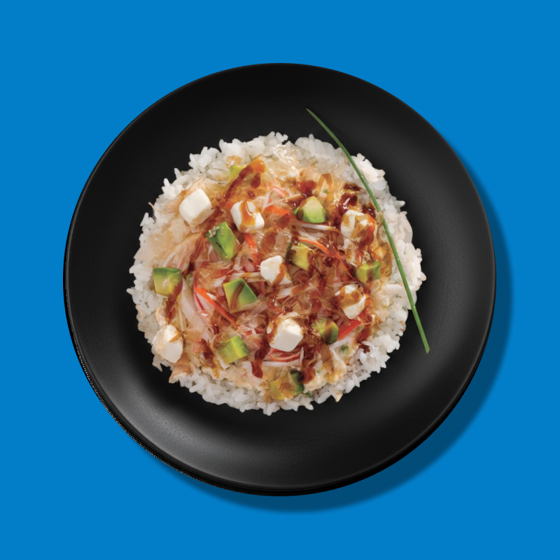 Arroz gohan con tampico, surimi (25 gr), queso crema, aguacate, hojuelas de katsuo y salsa dulce.
