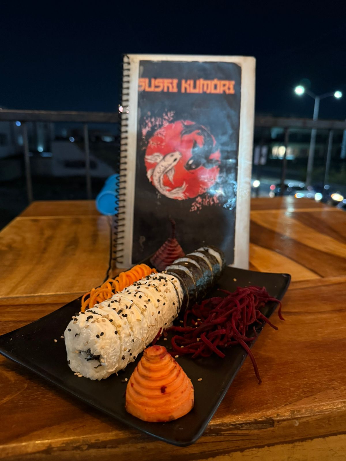 Incluye de 10 a 11 piezas aprox, California Vegetariano con alga por dentro, acompañado de aguacate, philadelphia, pepino, chile toreado y salsa de soya