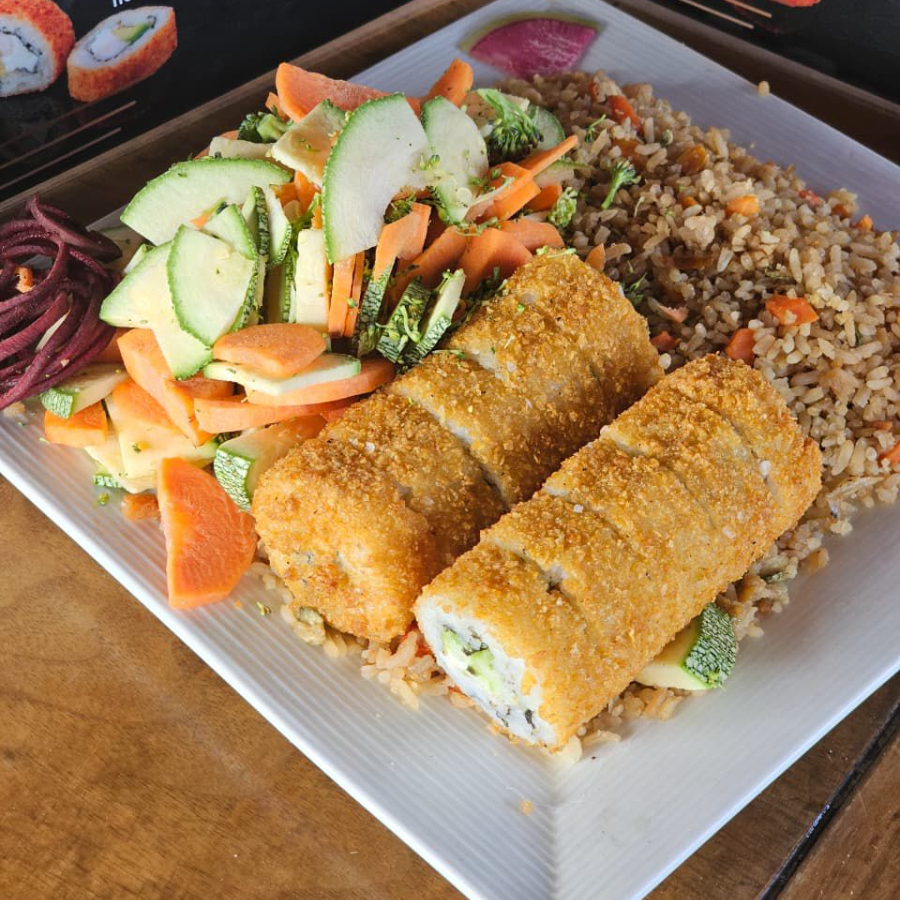 Delicioso medio sushi empanizado de pollo, acompañado de yakimeshi vegetariano, verduras, chile toreado y salsa de soya