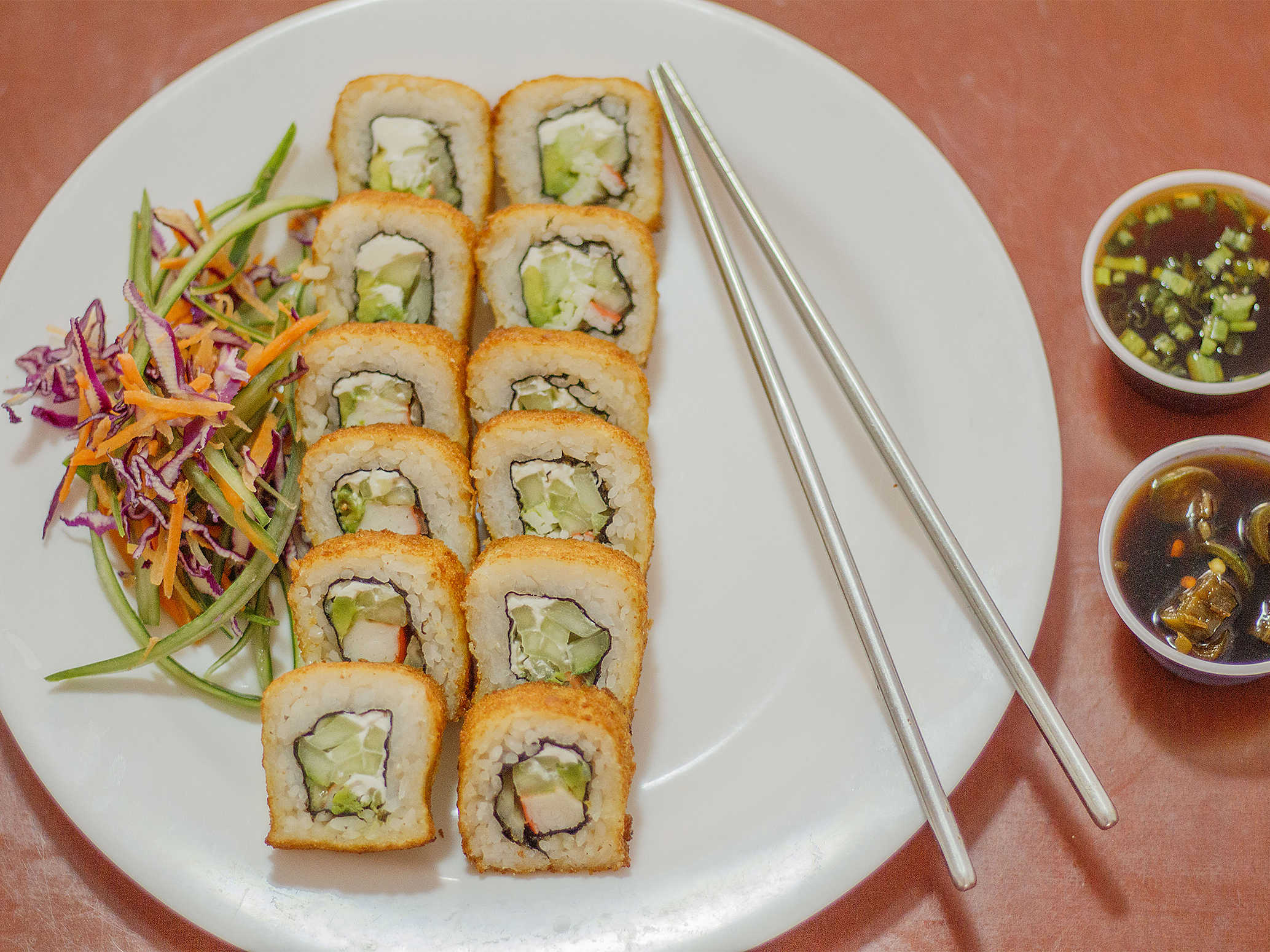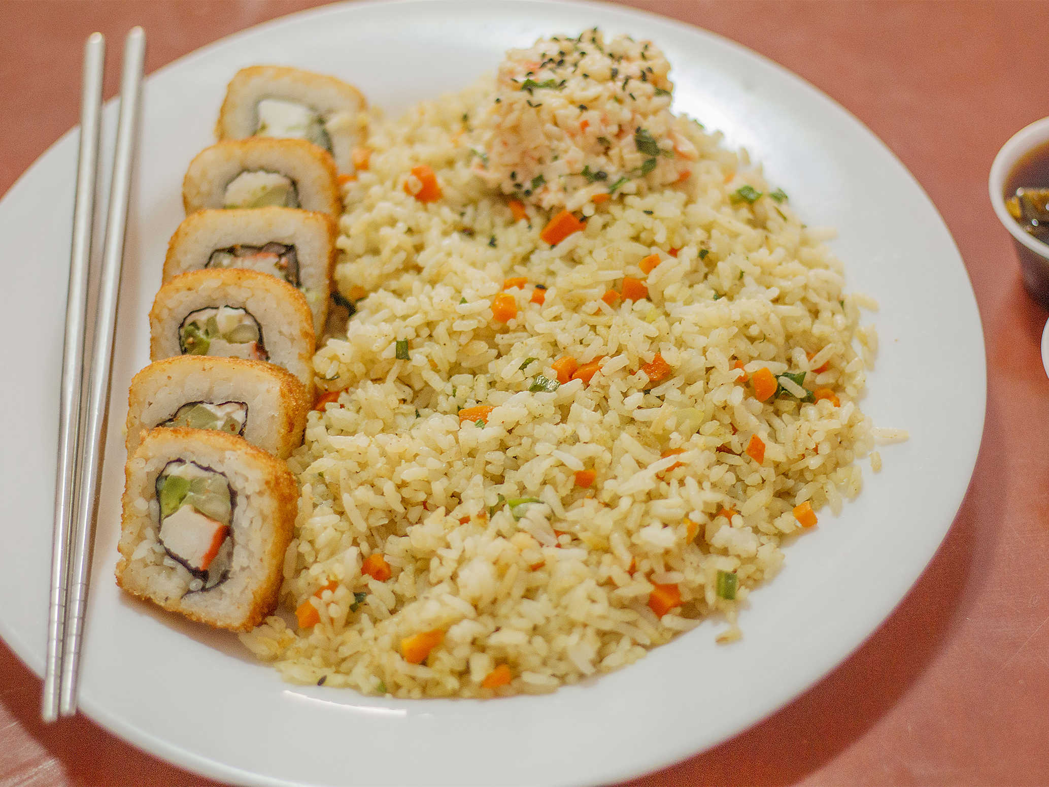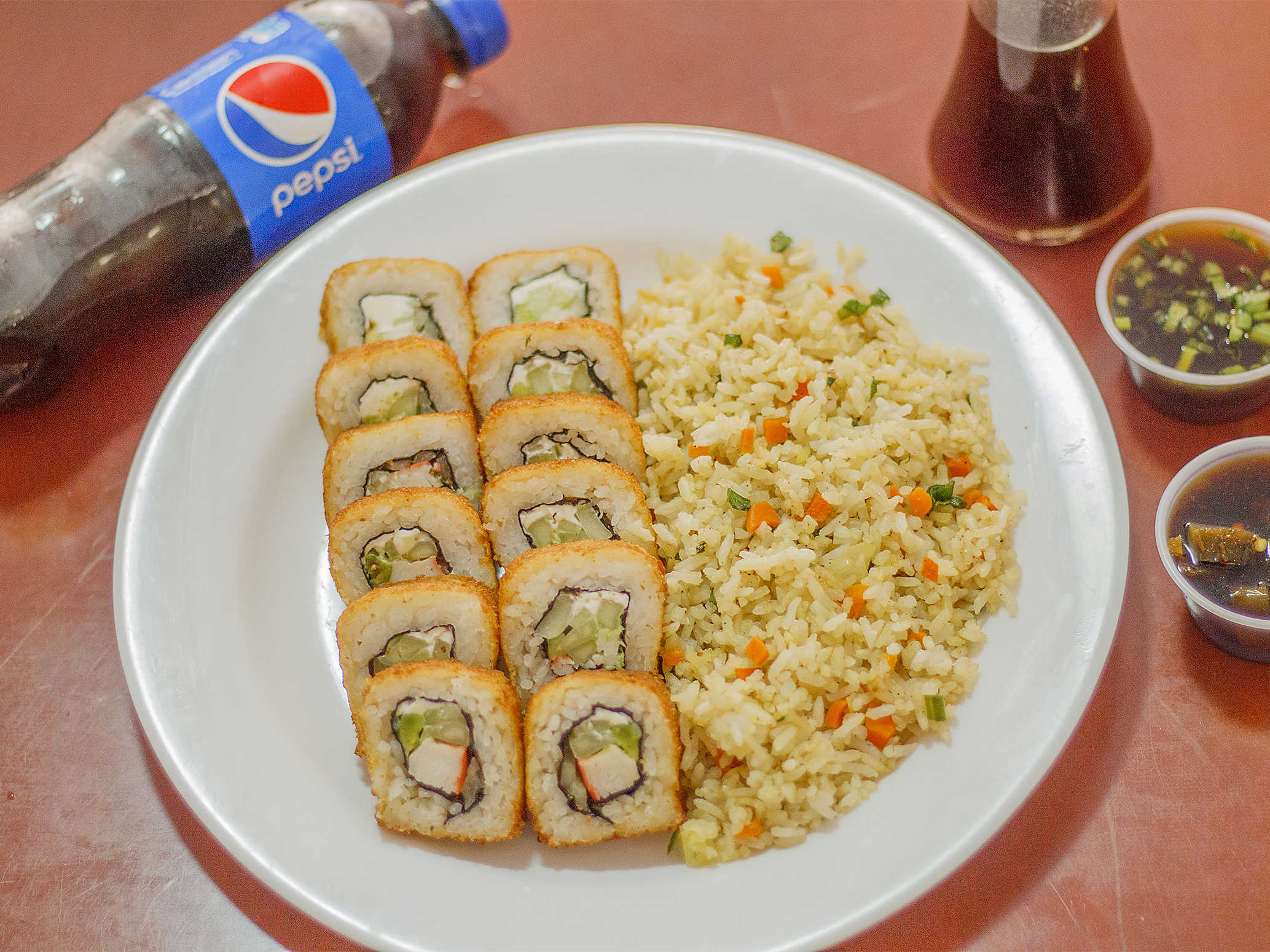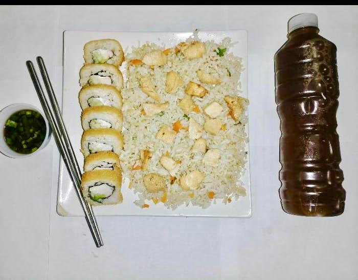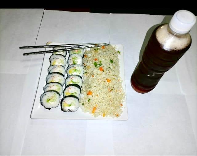 Arroz frito, 1/2 sushi empanizado acompañado de ensalada tampico.