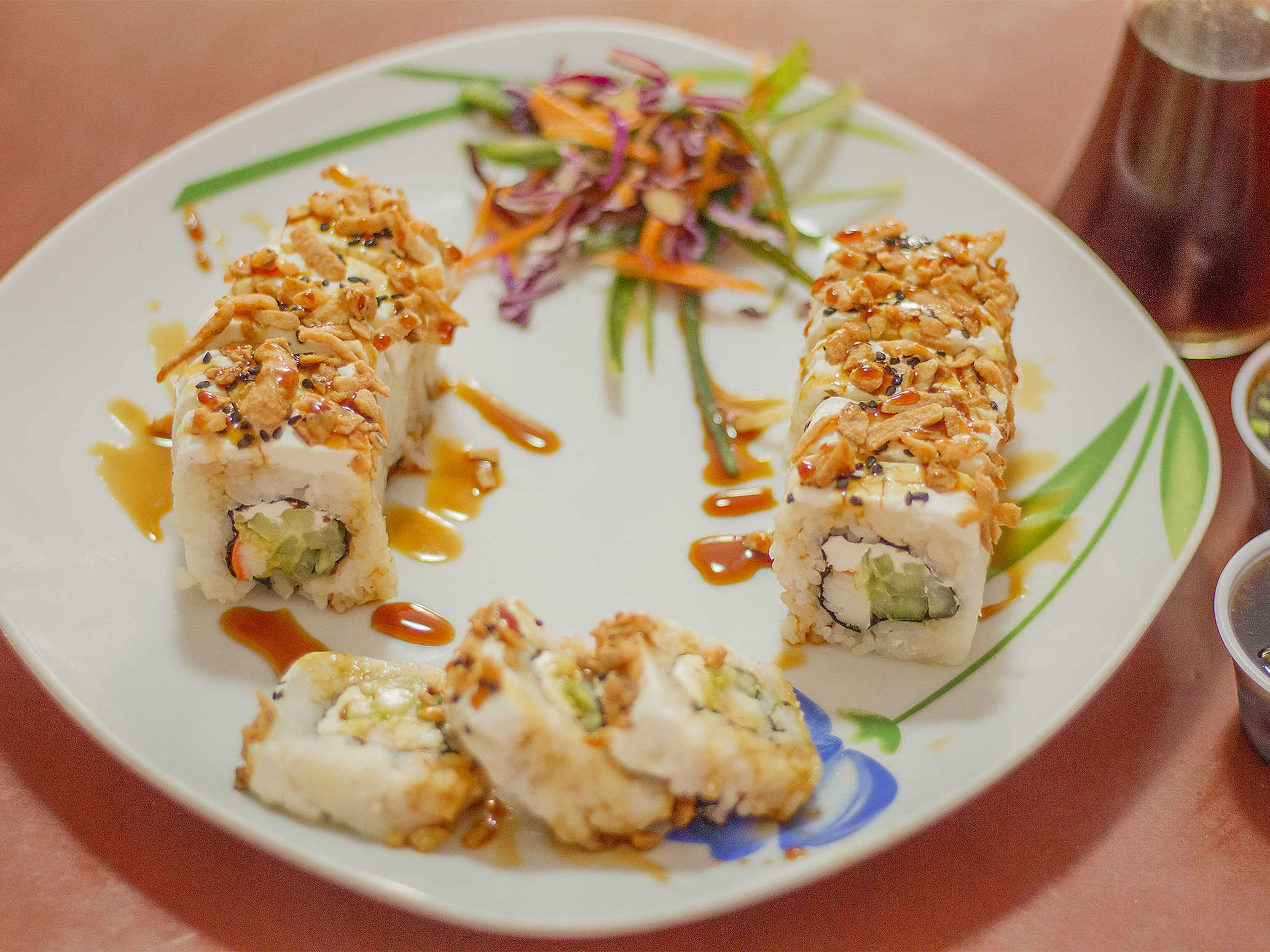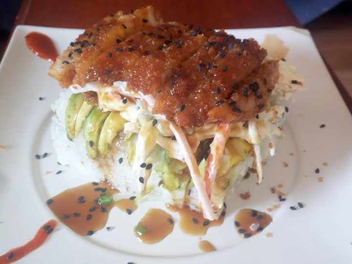 Rollo envuelto en aguacate con camarón empanizado, ensalada kanicama, bañado en salsa de anguila.