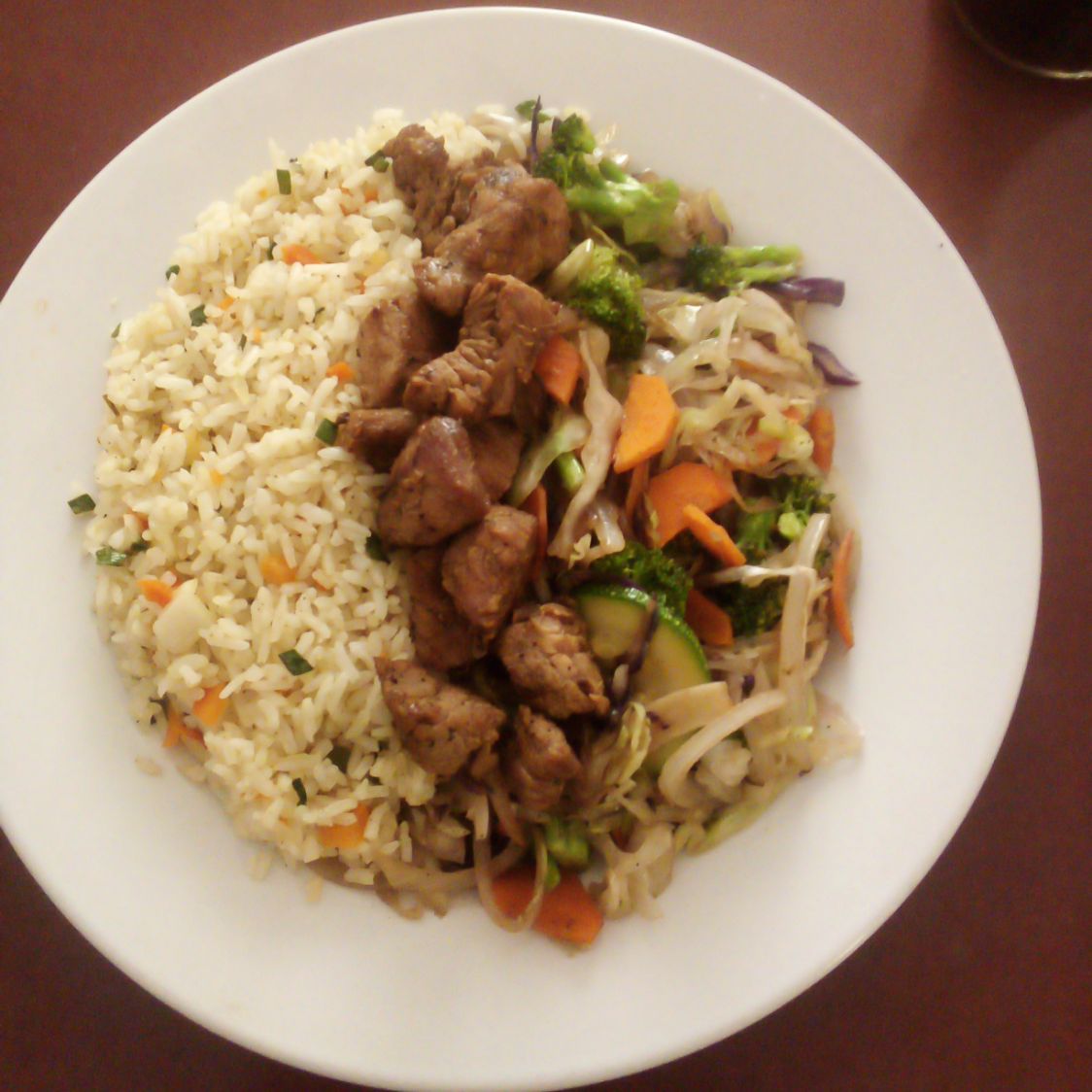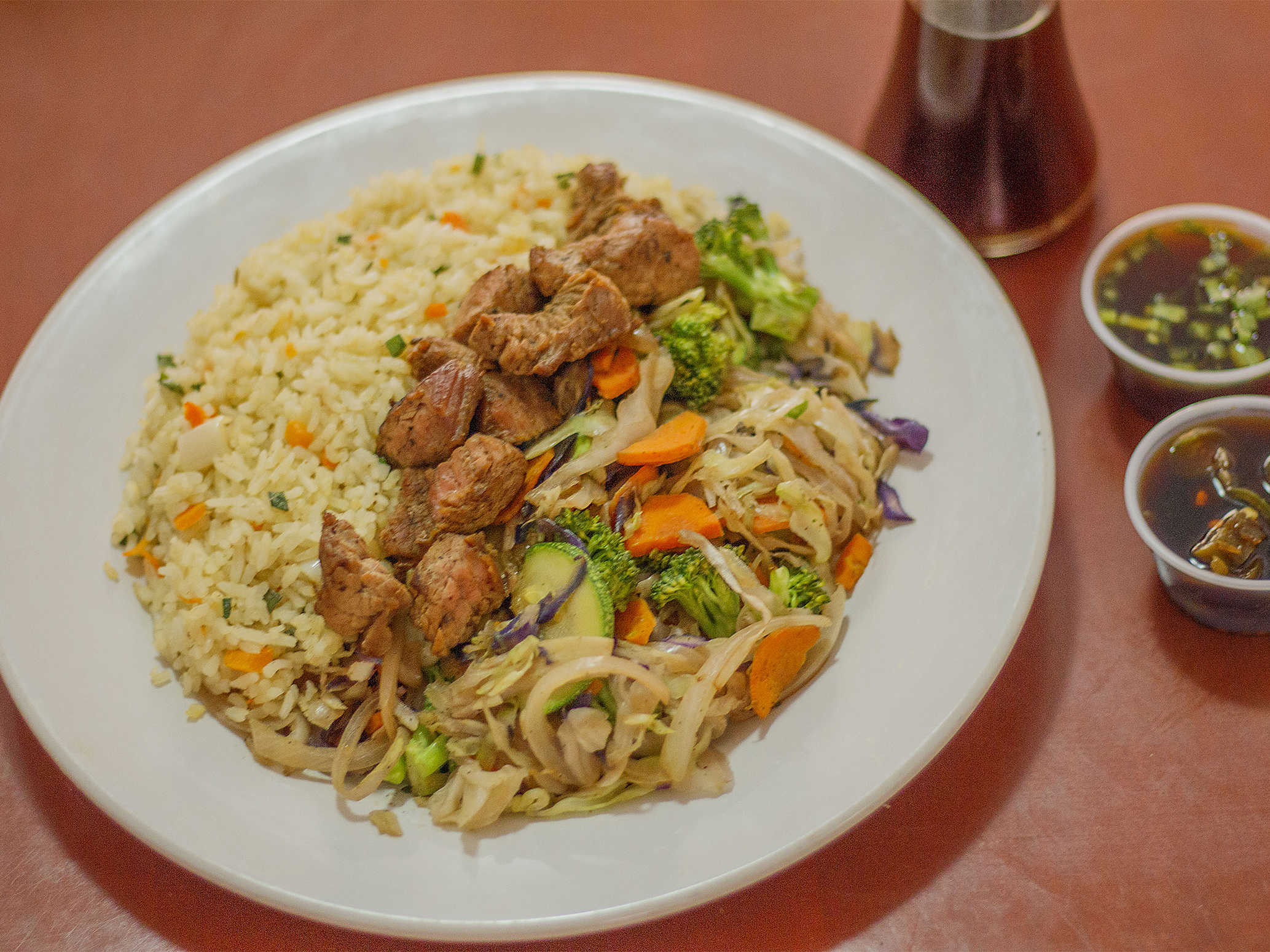 Verduras a la plancha acompañadas con arroz frito y las carnes sazonadas en salsa teriyaki.