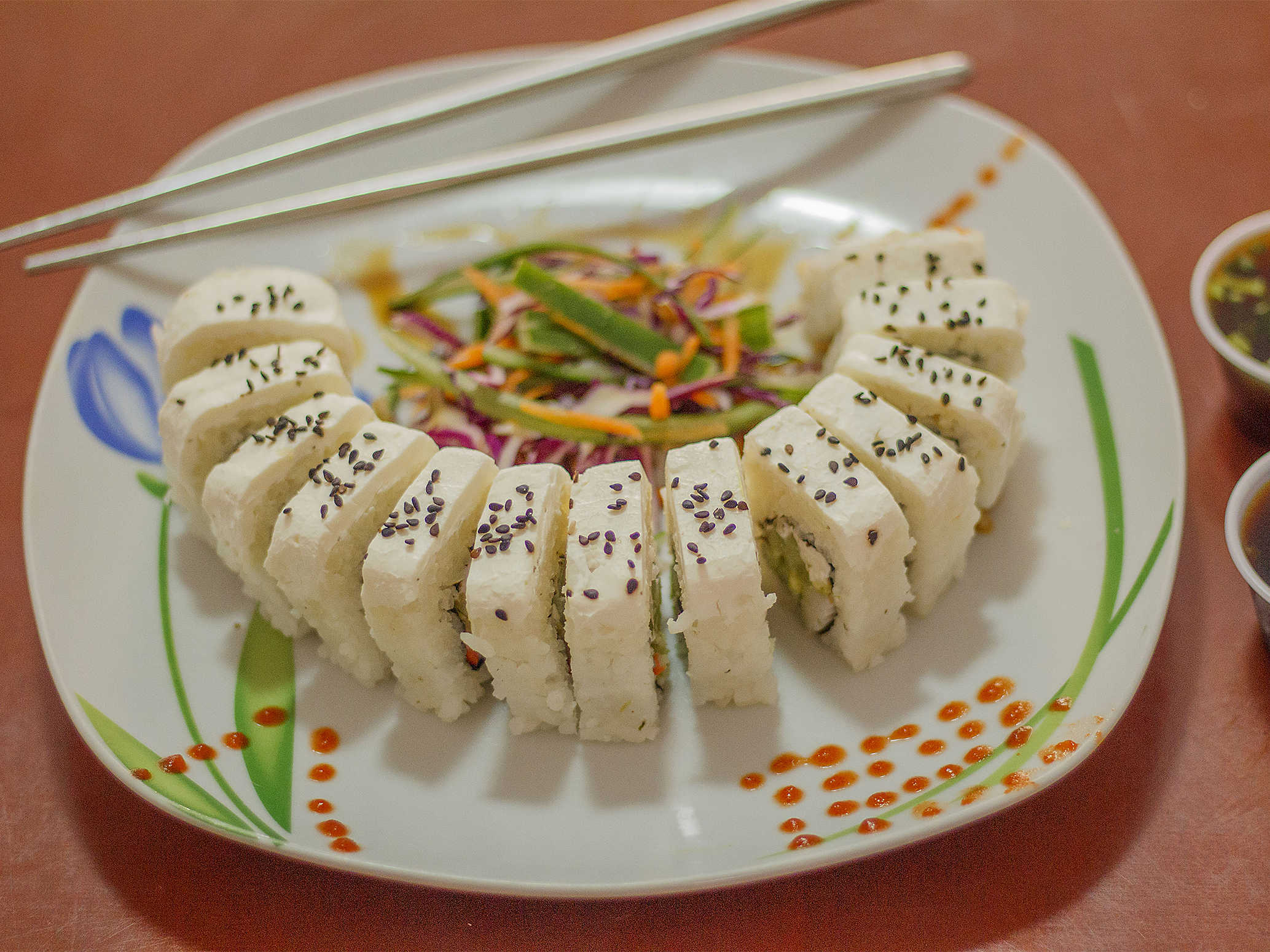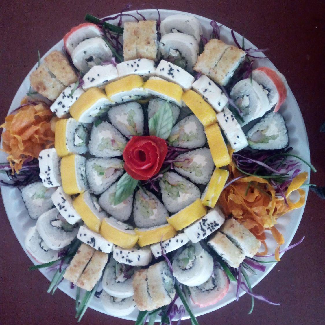 Sushi de arroz por fuera,relleno de pepino,aguacate y philadelphia.