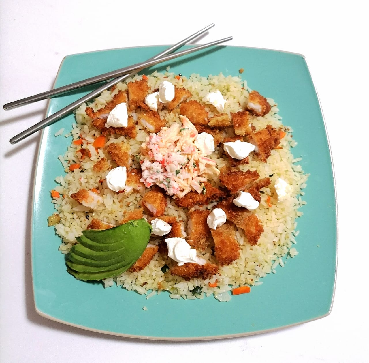 Arroz frito, con pollo empanizado, aguacate, philadelphia y ensalada tampico