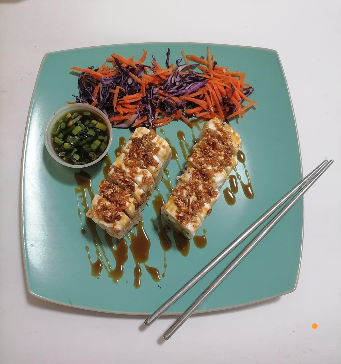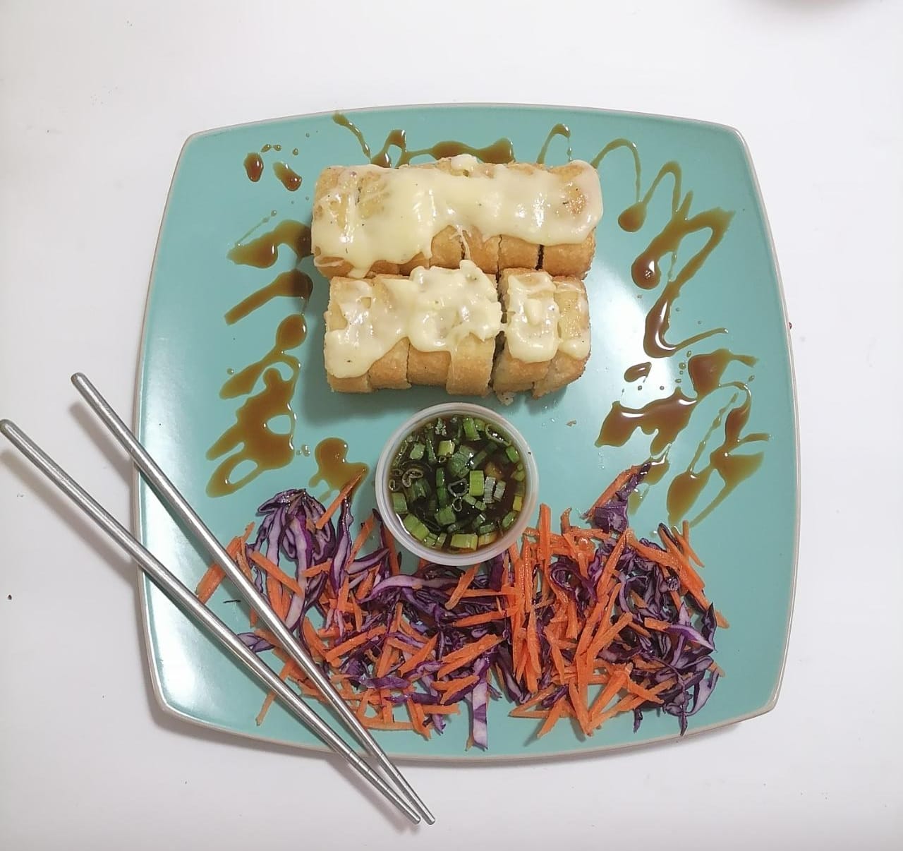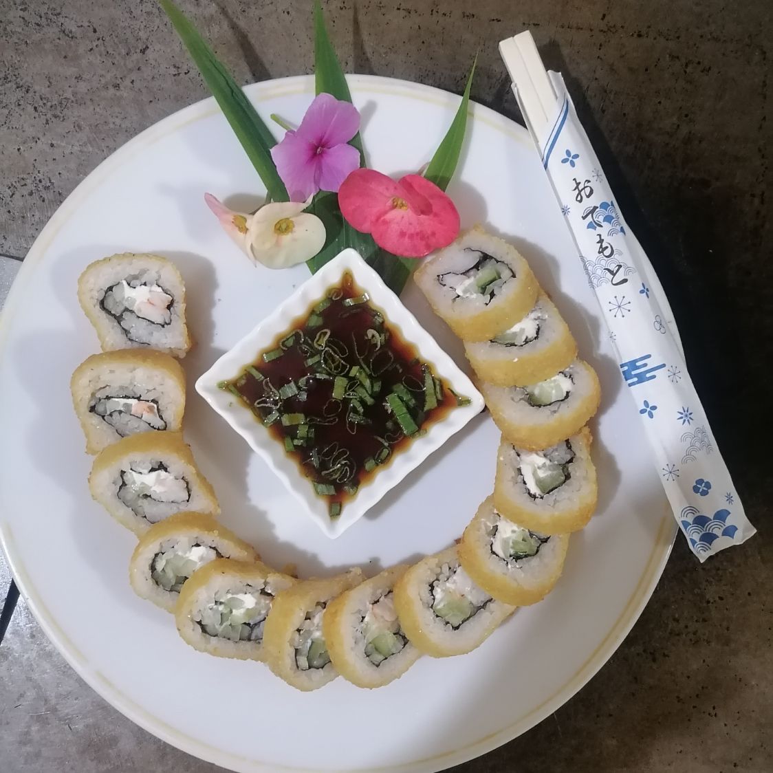 Sushi capeado con pasta tempura, relleno de pepino, philadelphia y aguacate, bañado con salsa de anguila
