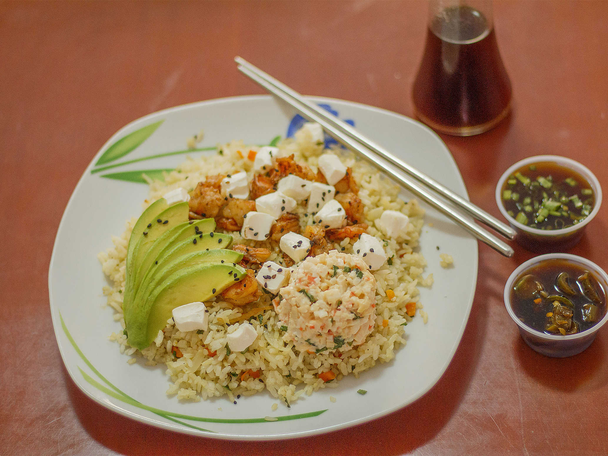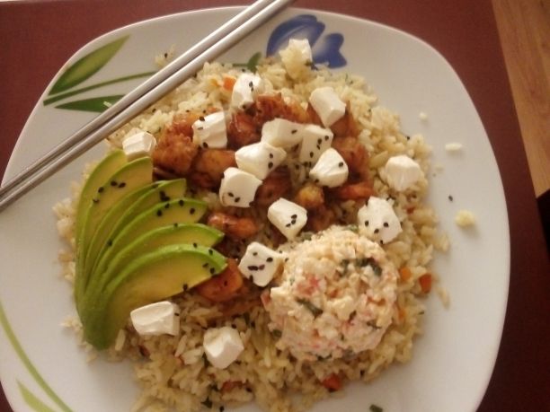 Arroz frito, con camaron, aguacate, queso philadelphia y ensalada tampico