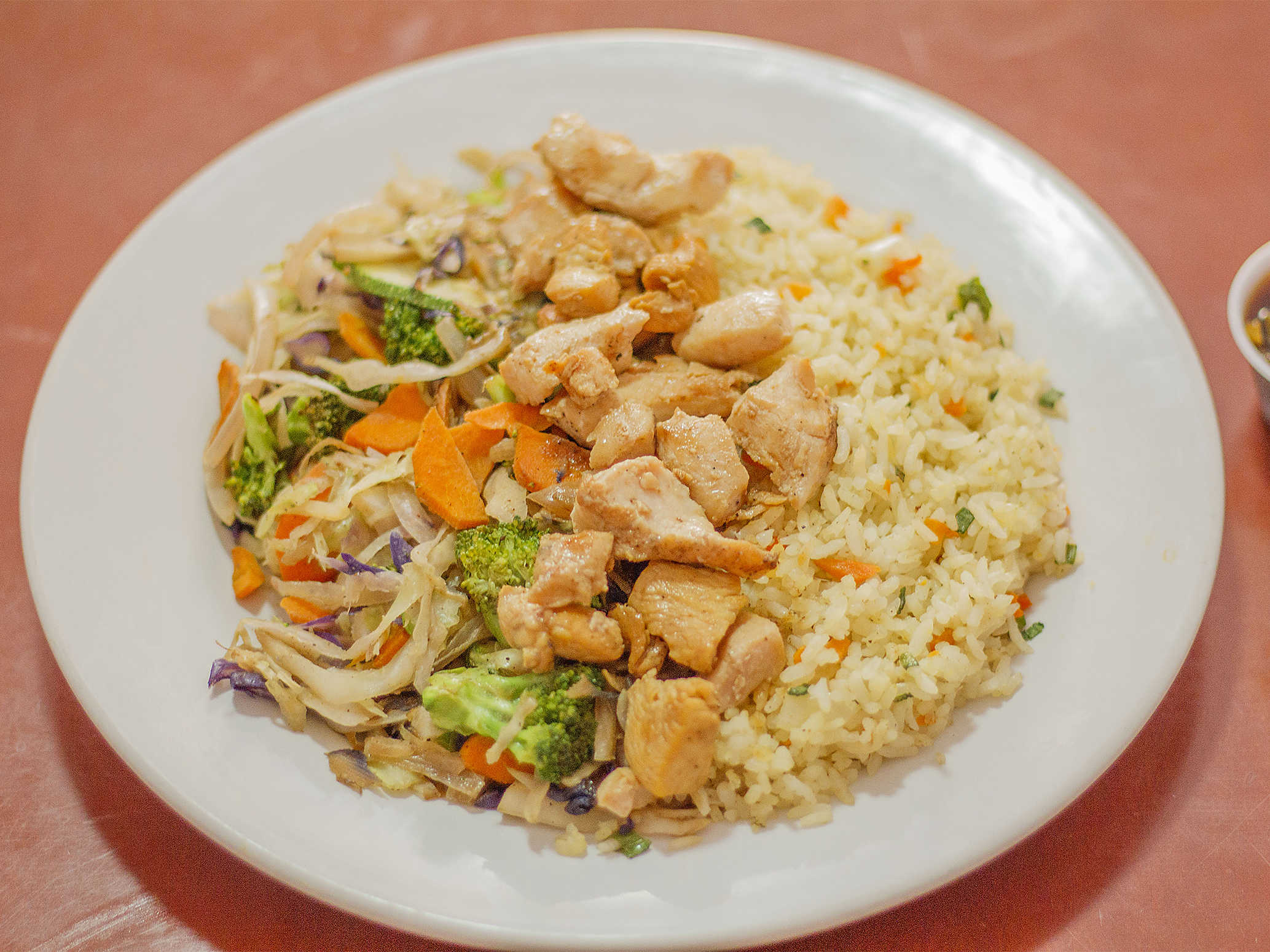 Verduras a la plancha, arroz frito y una porción de pollo capeado bañado con salsa agridulce.