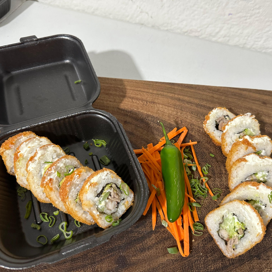 Rollo de arroz empanizado aguacate , Philadelphia,pepino, carne de res,camarón por dentro . Con una cara de Philadelphia
