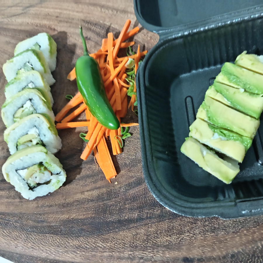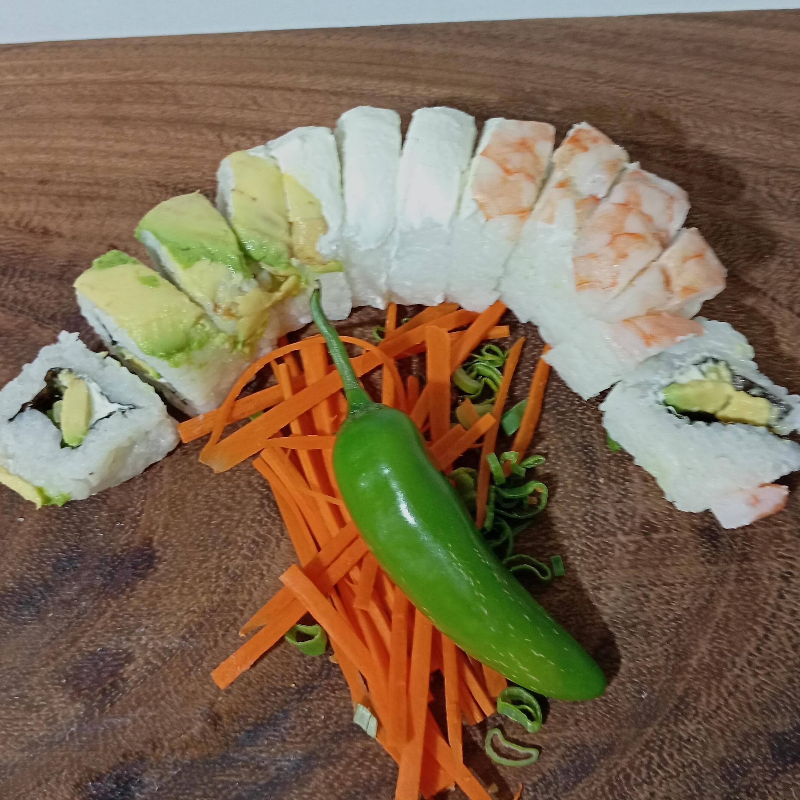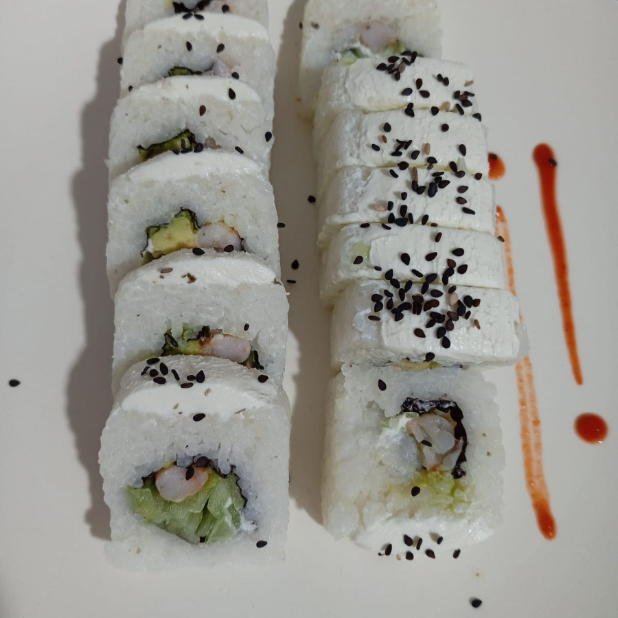 Rollo de arroz, Philadelphia,aguacate,pepino y camarón . Por fuera una cubierta de aguacate, Philadelphia y camarón .