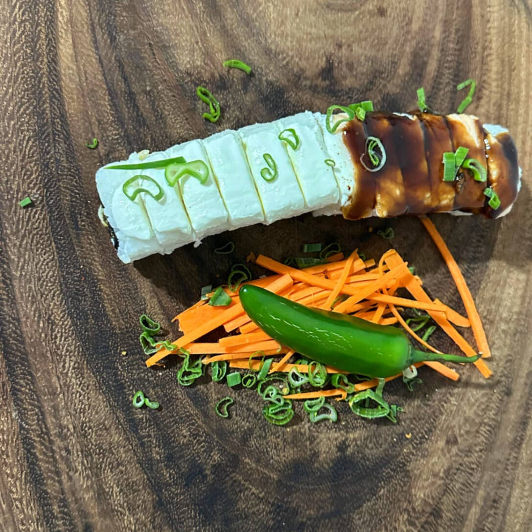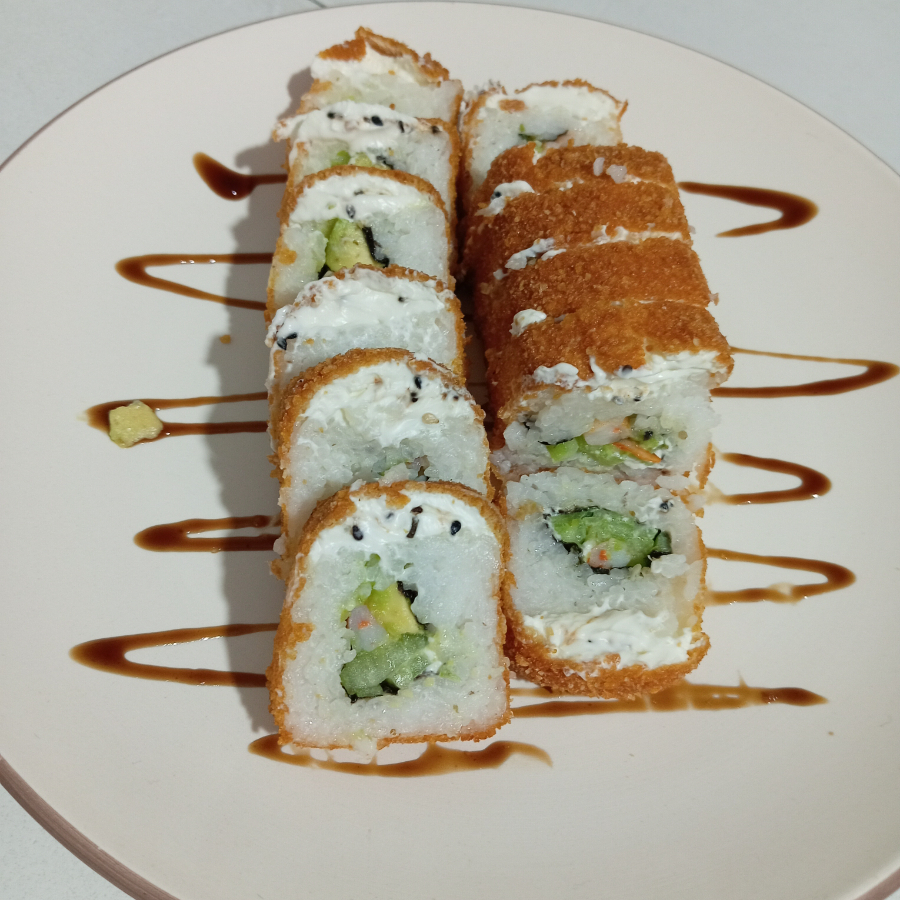 Rollo de arroz queso Philadelphia,pepino,aguacate por dentro. Queso amarillo,queso mozarella y queso Philadelphia, empanizado