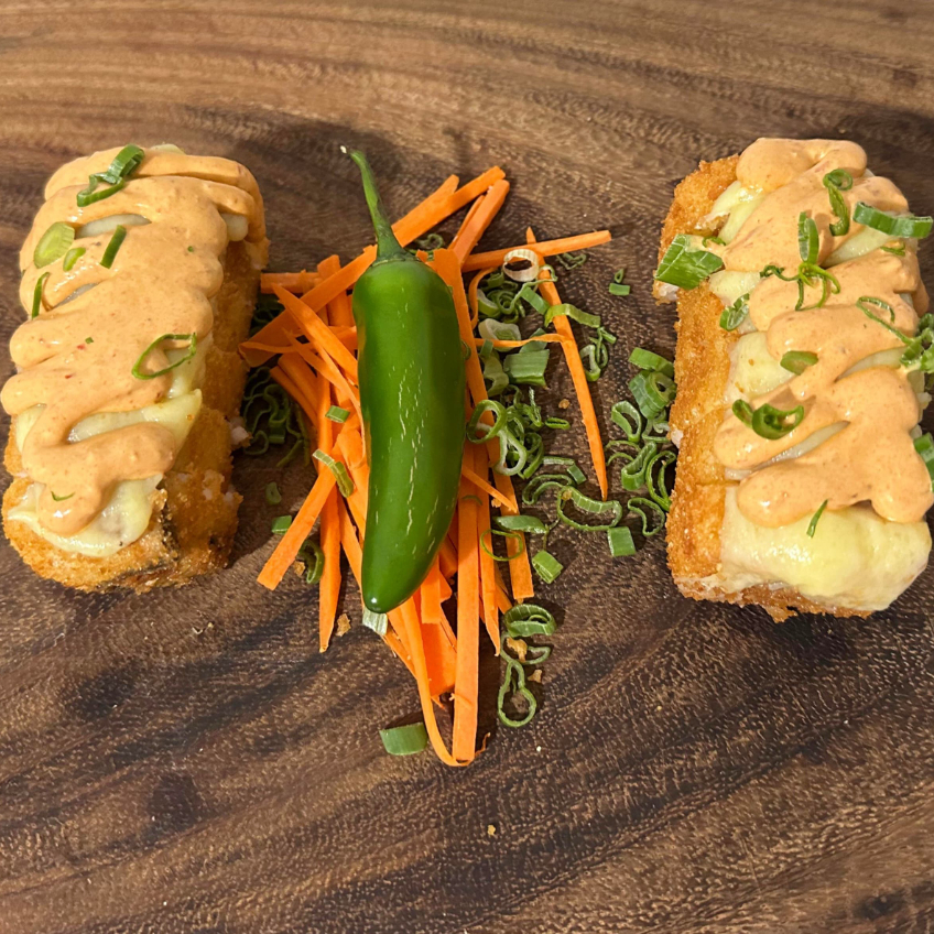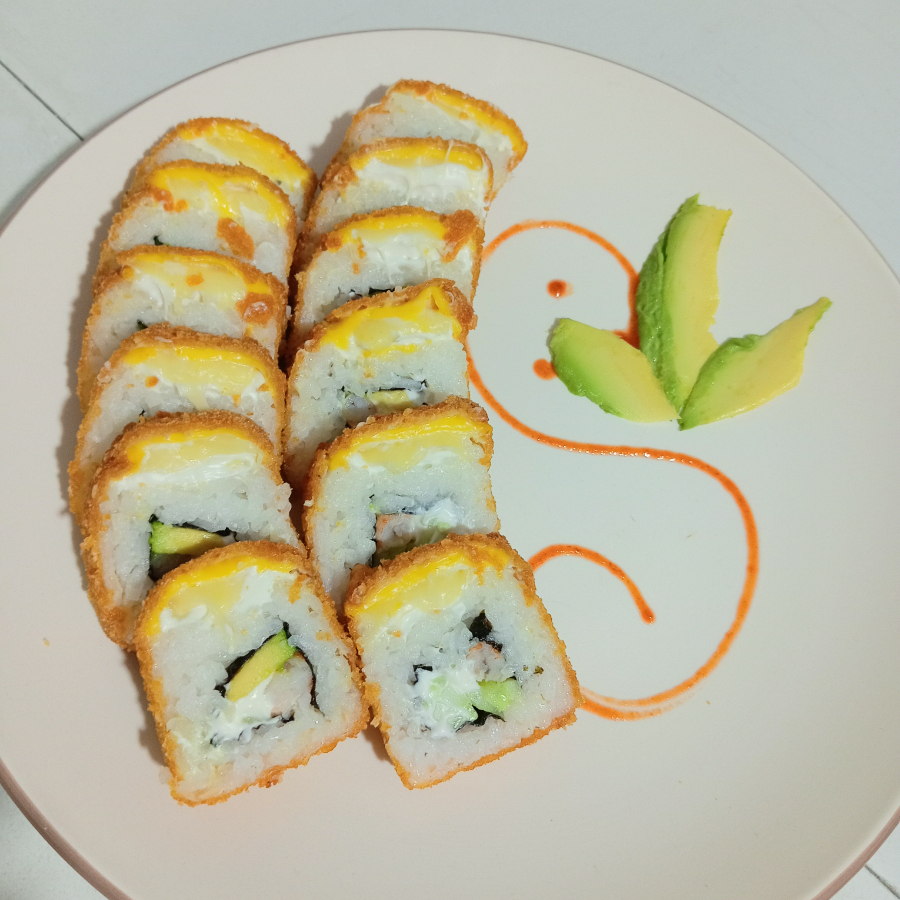 Rollo de arroz empanizado , aguacate , Philadelphia,pepino por dentro . Coronado con queso mozarella gratinado y aderezo de chipotle