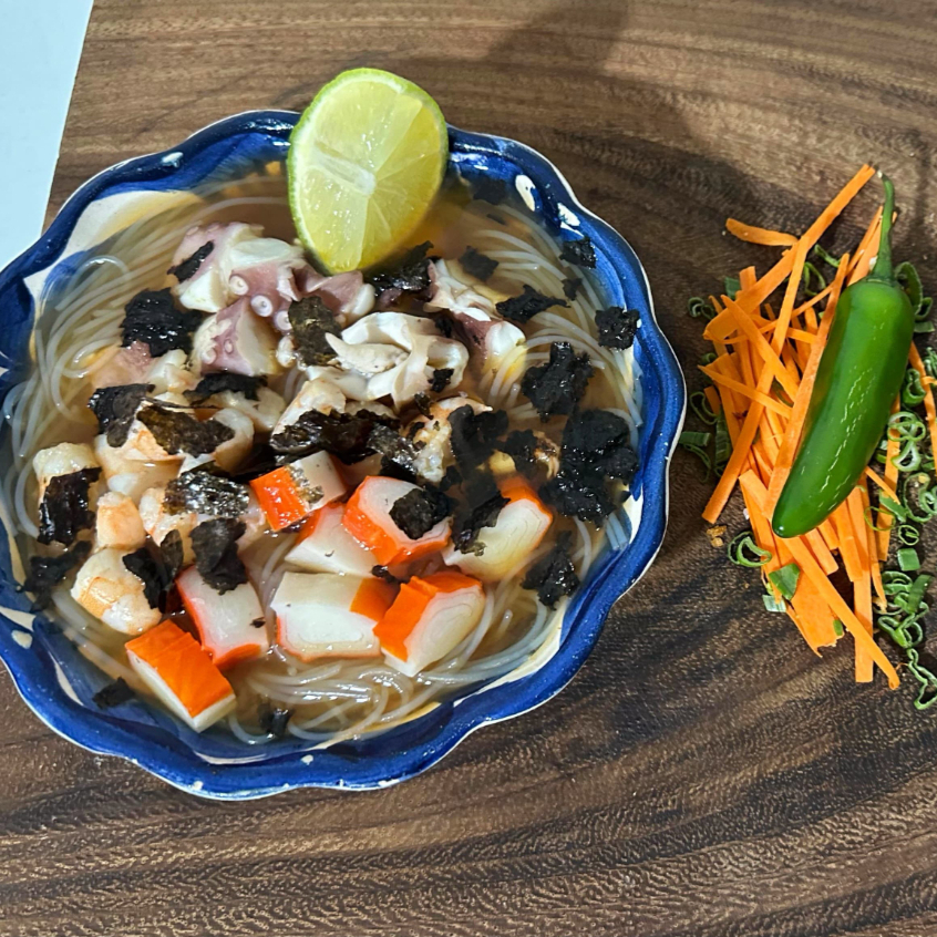 Caldo con fideo japones acompañado de trozos de camaron, surimi, pulpo y alga en trozo, acompañado con aguacate.