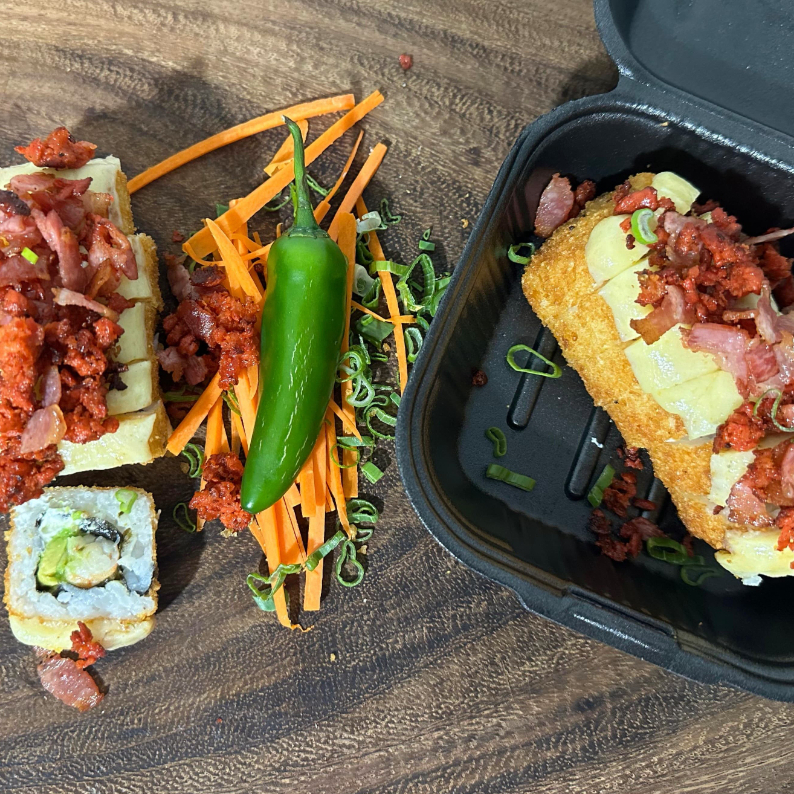 Rollo de arroz empanizado,pepino , aguacate y Philadelphia por dentro. Coronado con queso mozarella, chorizo y tocino