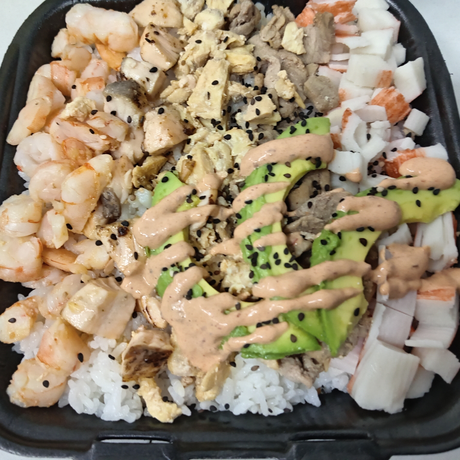 Una cama de arroz al vapor, con camaron, con 5 proteínas (camaron, res, pollo, salmon y surimi), preparado con aguacate y philadelphia.