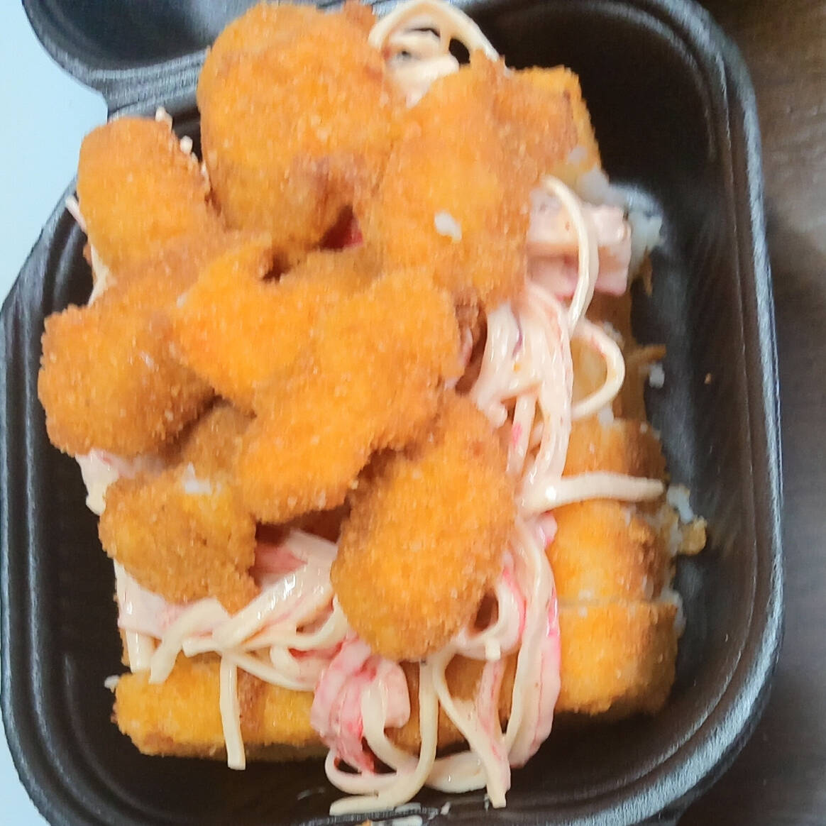 Rollo de arroz empanizado con queso Philadelphia, aguacate,pepino,camarones empanizado.coronado con ensalada de kanicama con aderezo de chipotle