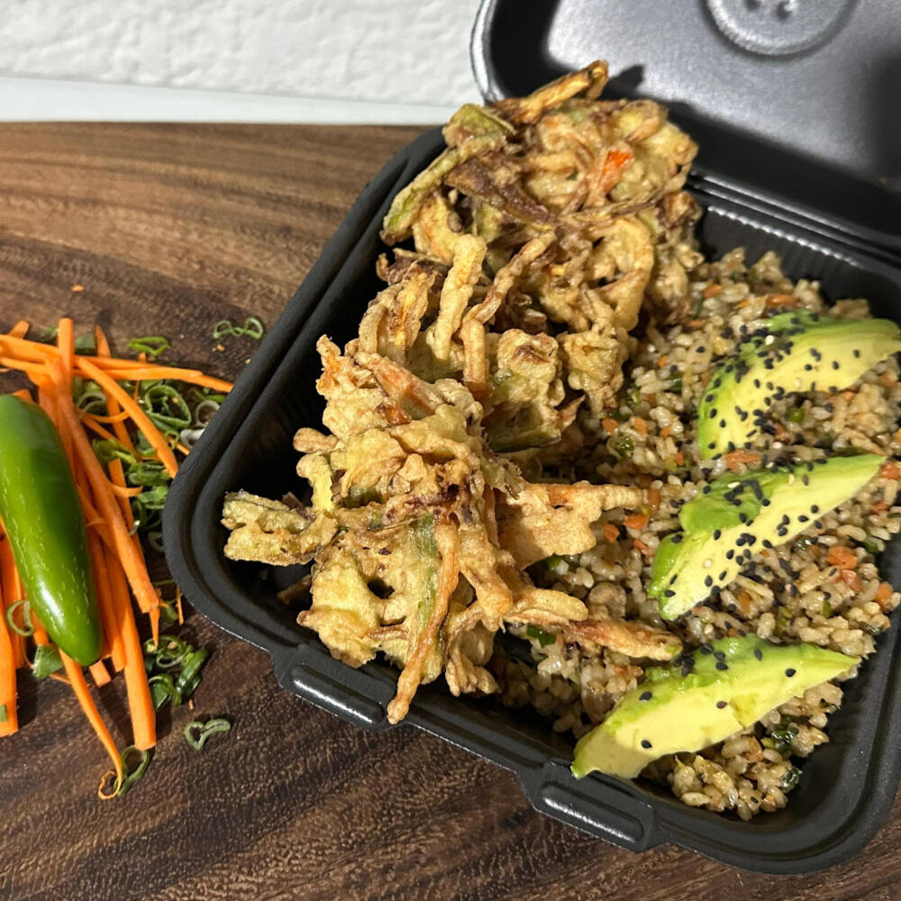 Combinacion de verduras capeadas con acompañadas de arroz frito y proteína a tu elección.