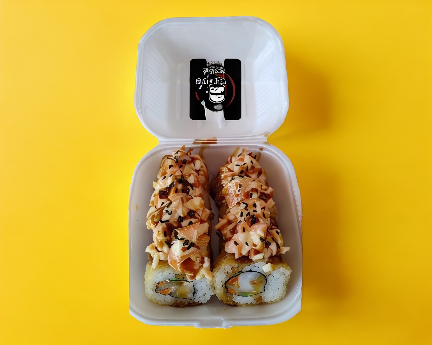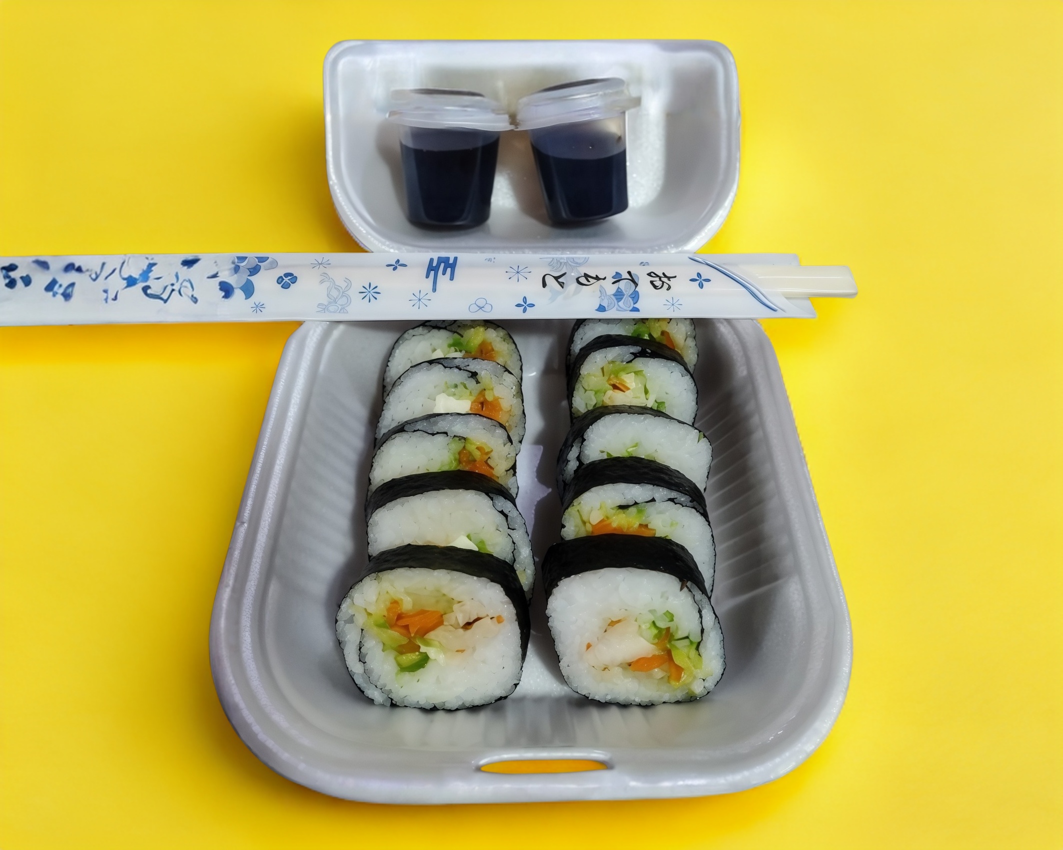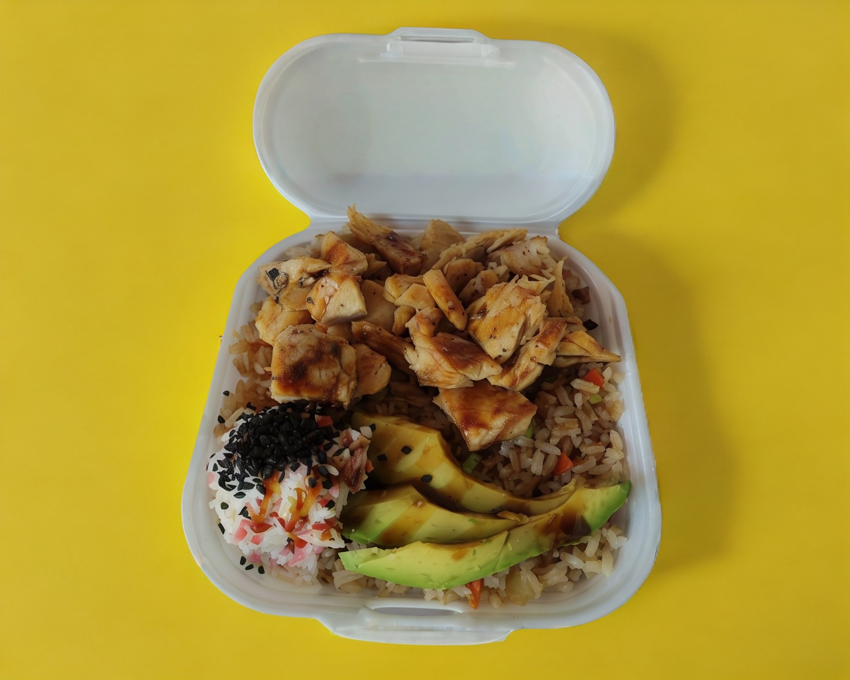 1 Porción Personal de Medio Yakimeshi (Media porción de arroz) Incluye 2 piezas de camarón, medio rollo de sushi (5 bocados)con aguacate, 2 bolsitas de salsa de soya, 1 aderezo chipotle de 5 oz y una bebida en lata de 355 ml a elección del cliente. incluye salsas (porcion personal)