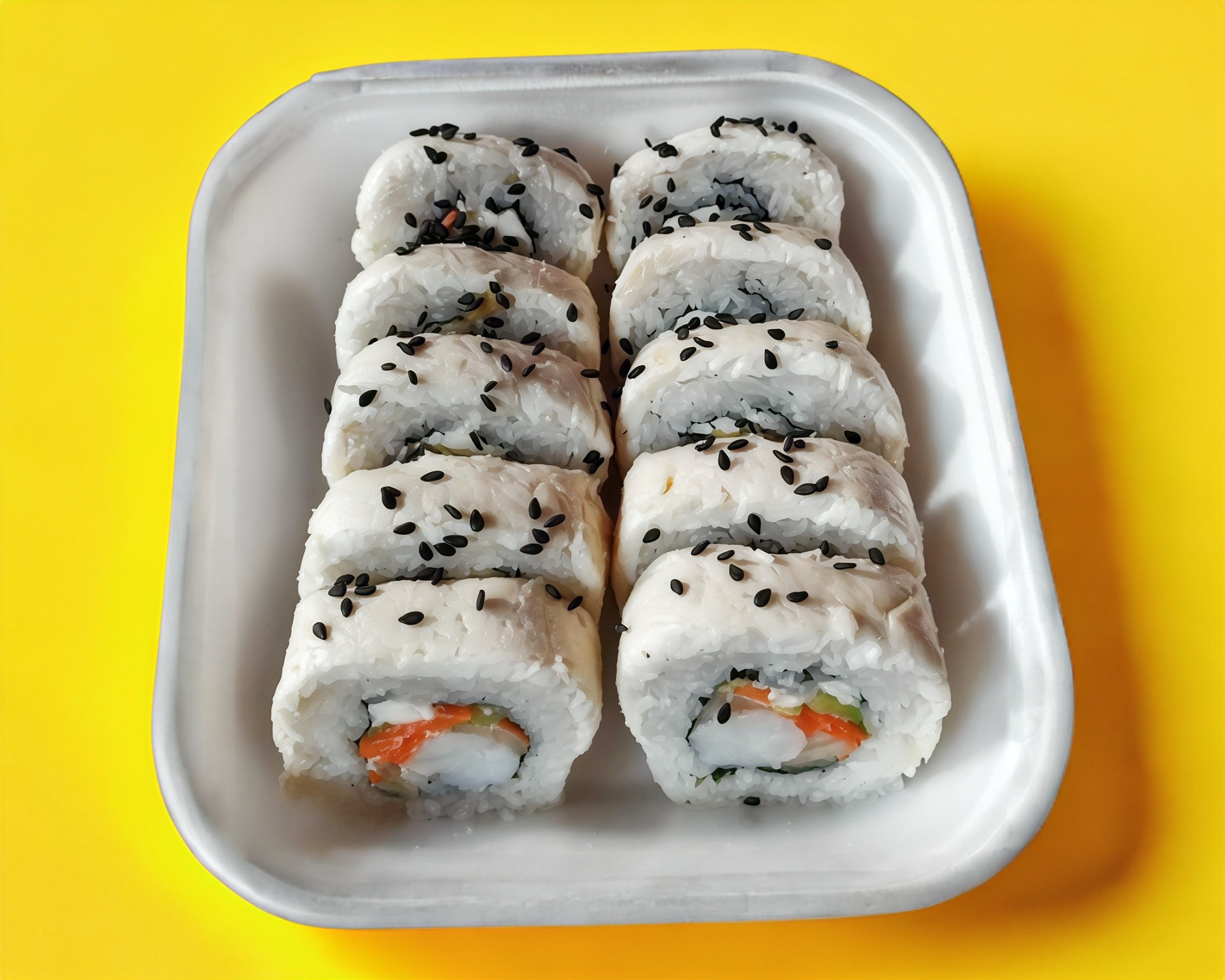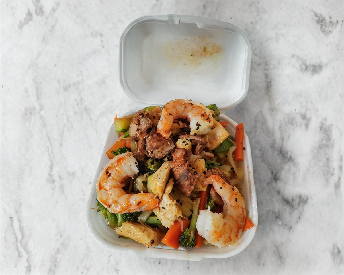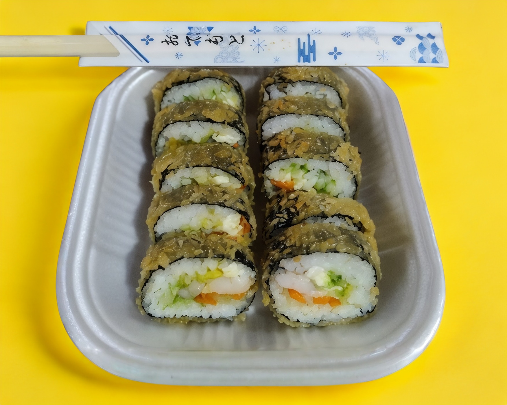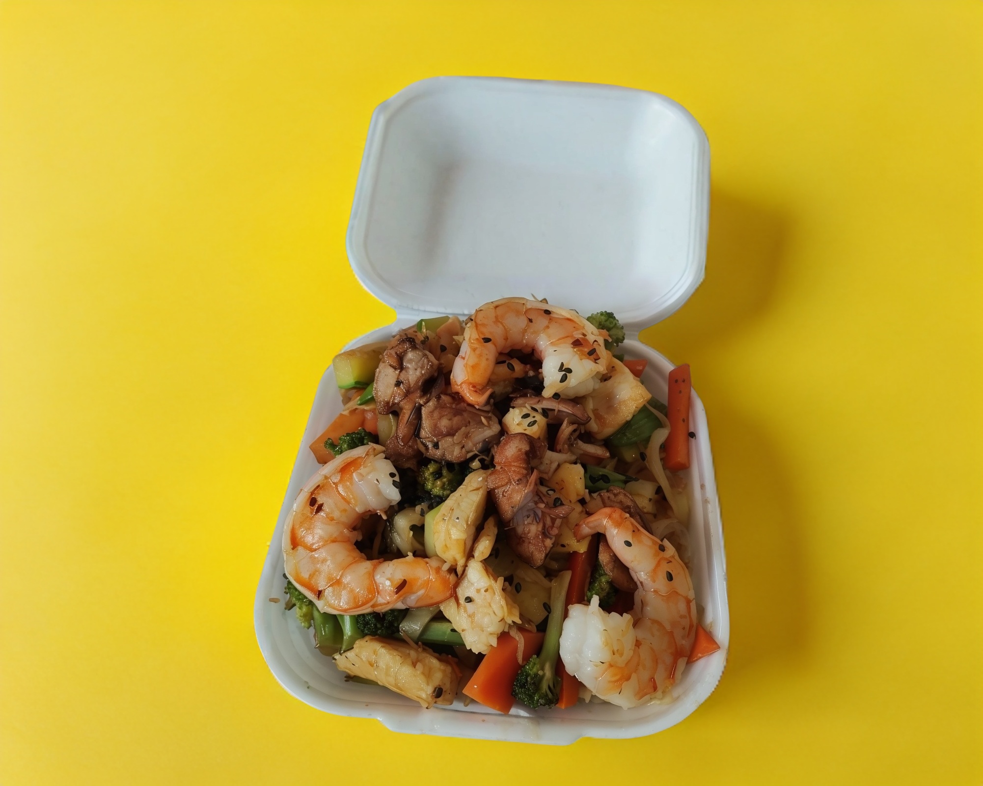 1 Porción Personal de Medio Yakimeshi (Media porción de arroz) Incluye 2 piezas de camarón, medio rollo de sushi (5 bocados)con aguacate, 2 bolsitas de salsa de soya, 1 aderezo chipotle de 5 oz y una bebida en lata de 355 ml a elección del cliente. incluye salsas (porcion personal)