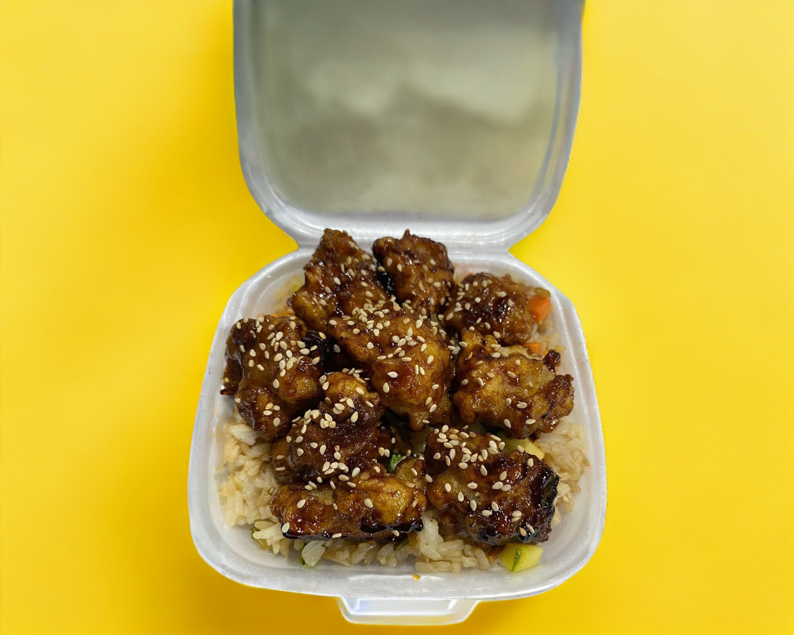 250g de pollo a la naranja, acompañado de una porcion de arroz frito, ajonjoli y chile seco.