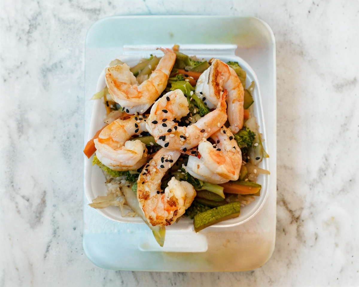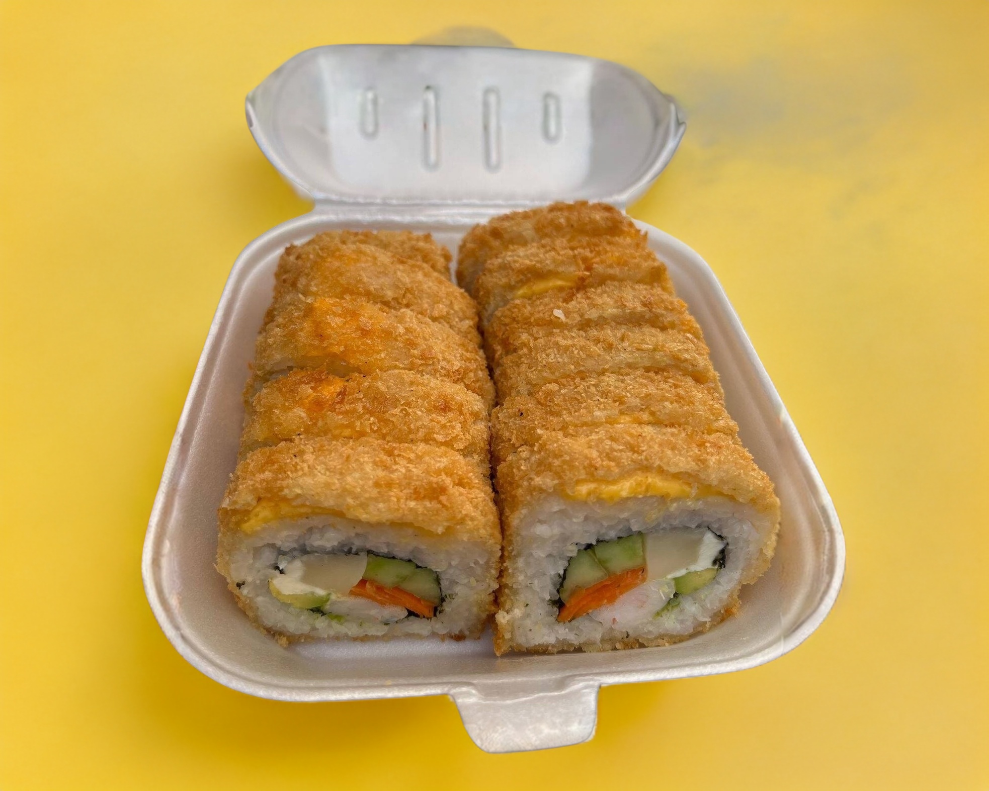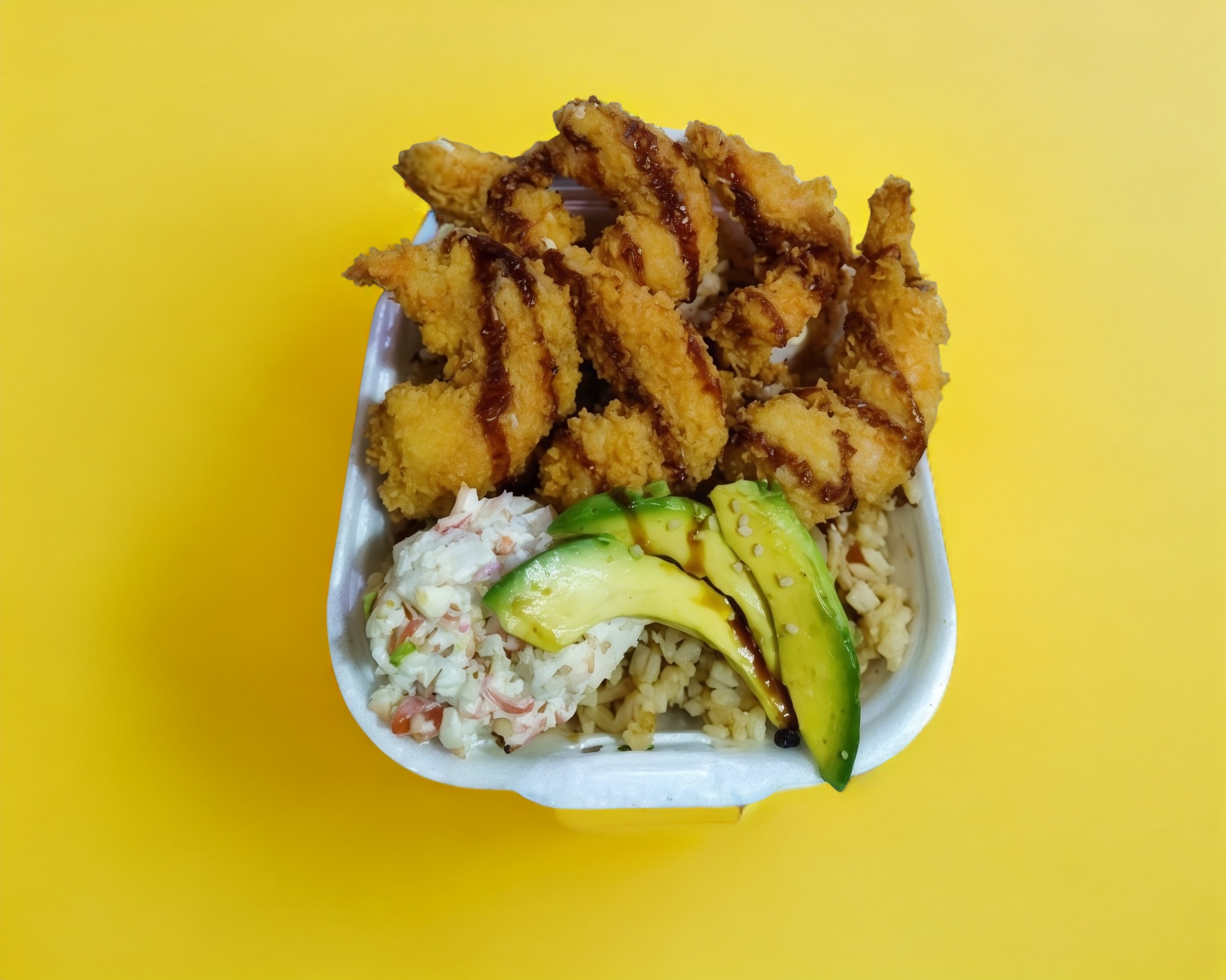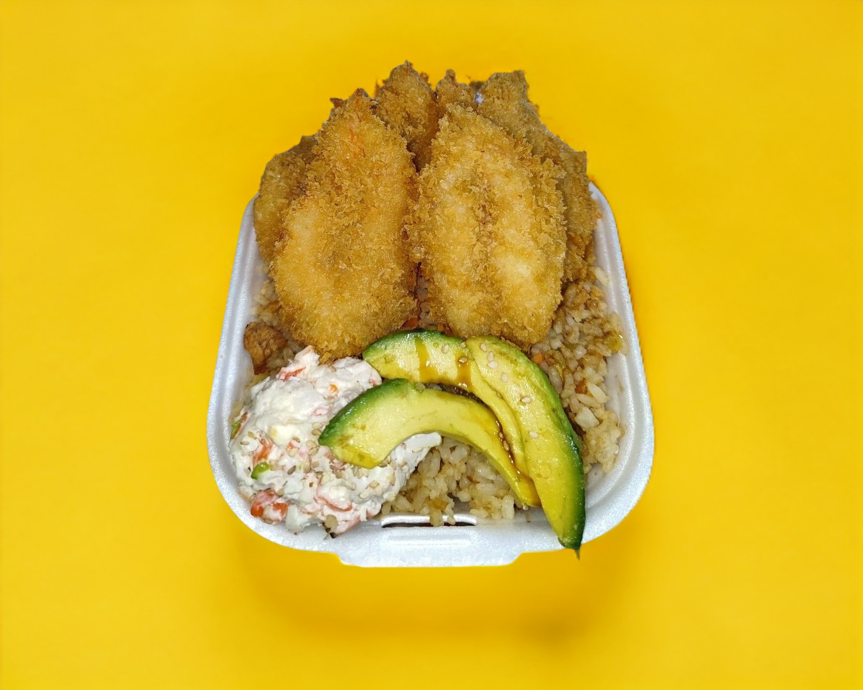 6 camarones empanizados rellenos de philadelphia con porción de arroz frito, aguacte y ensalada de surimi.