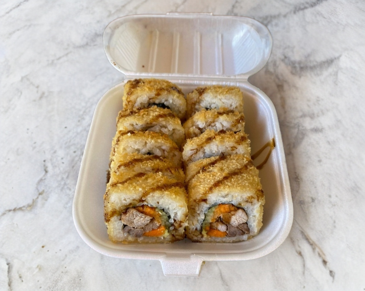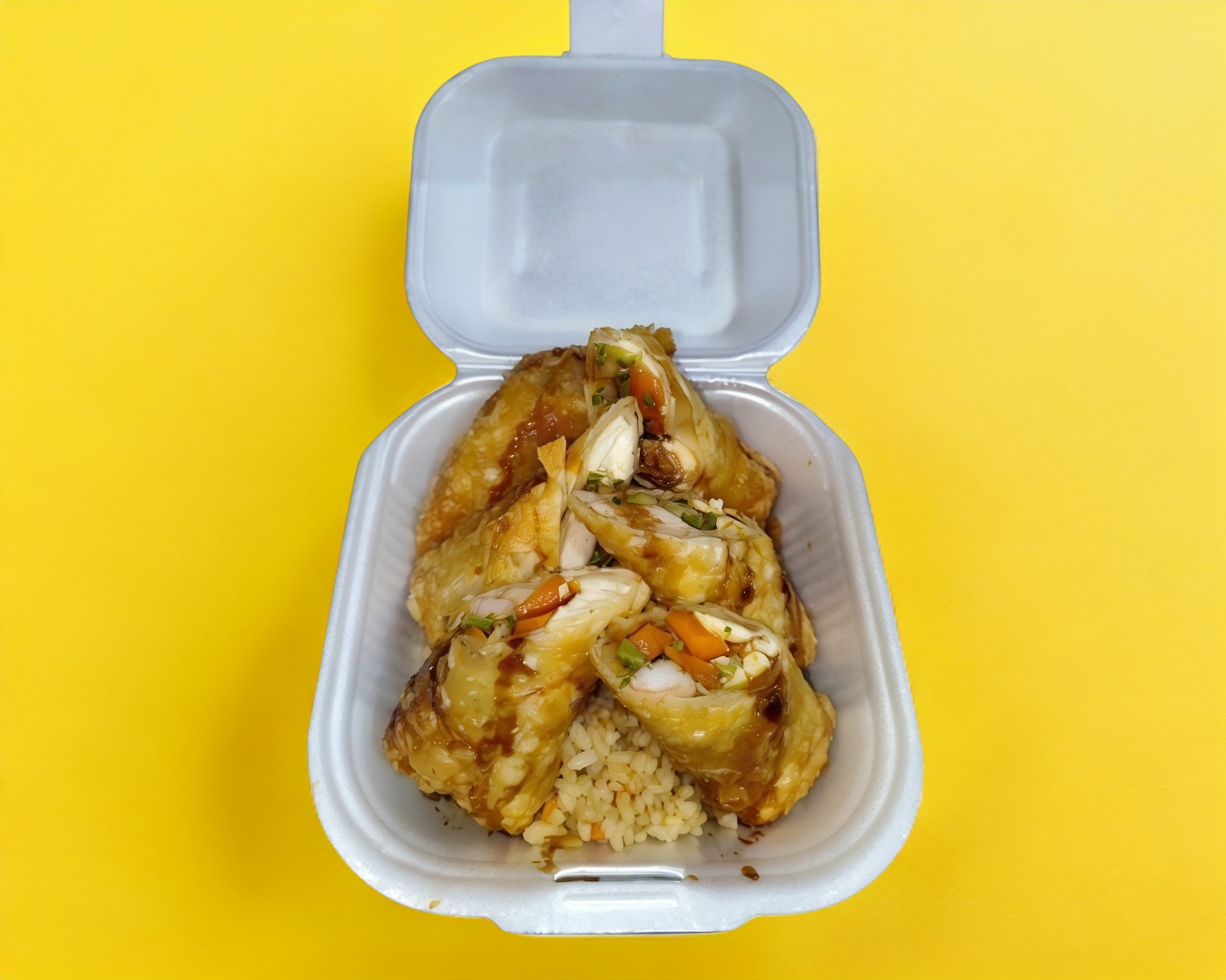 Orden de Rollos Primavera (6 piezas) , acompañados de 250 gramos de arroz frito y la proteína a elección.( Camarón Pollo. Res. Mixto.Vegetariano.)aparte lleva 2 bolsitas de soya, 1 aderezo chipotle 5 onzas
