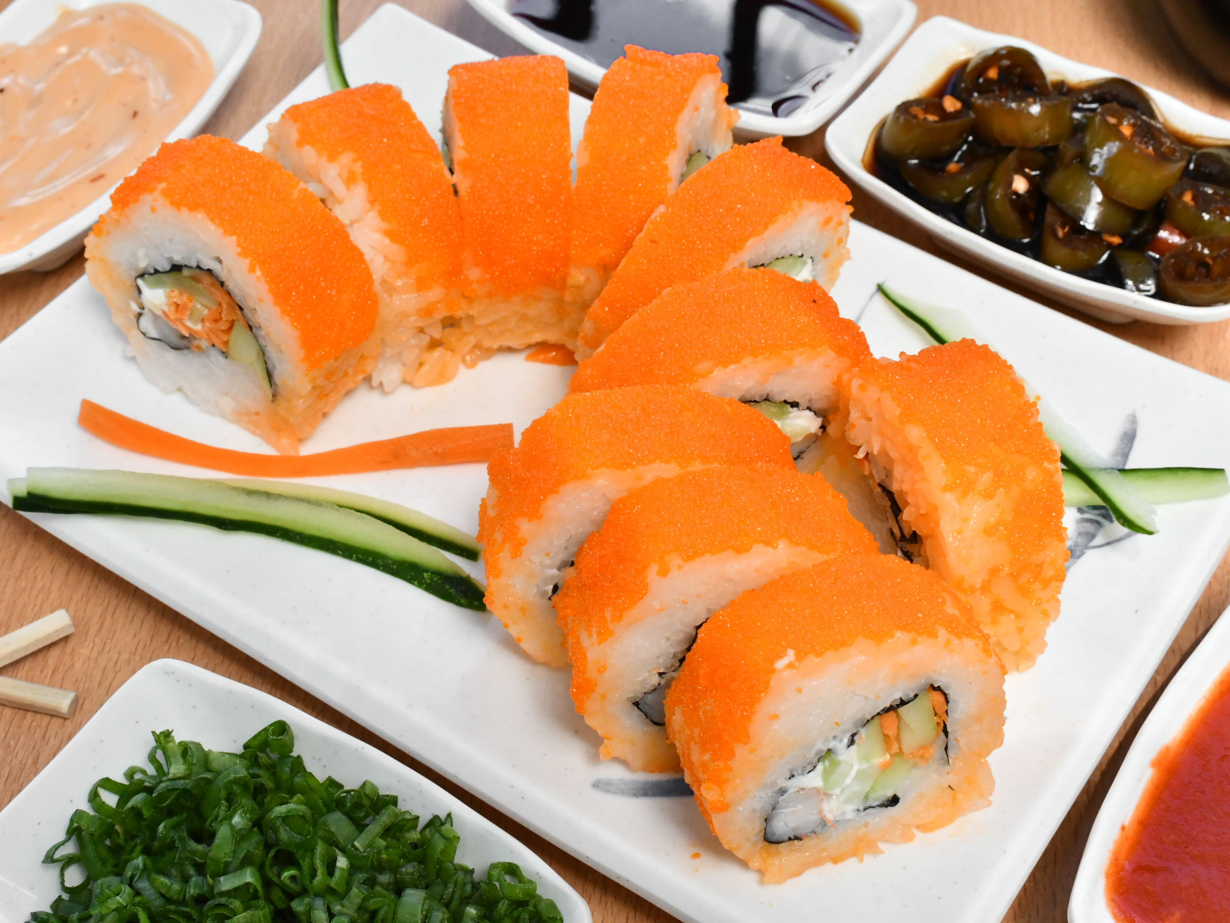 Philadelphia, aguacate, pepino y zanahoria por dentro, masago por fuera.
