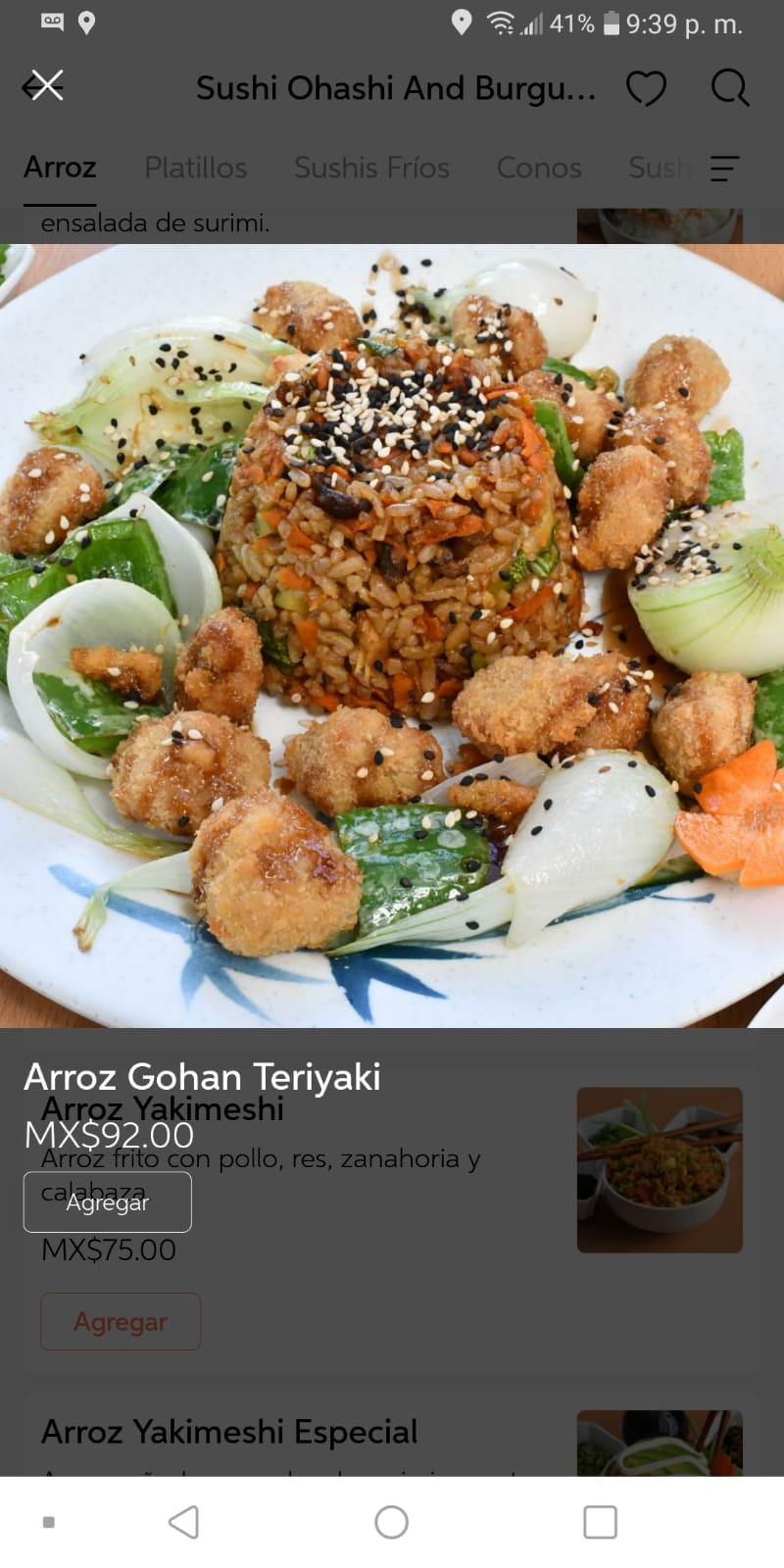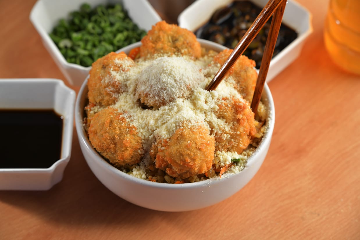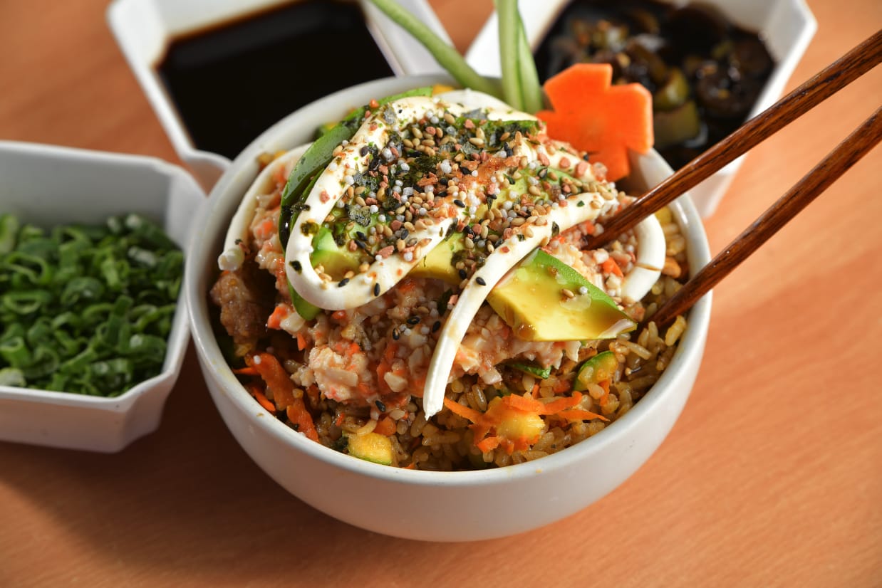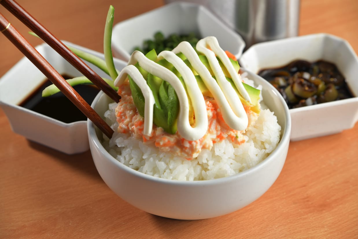 Arroz acompañado con ensalada de surimi, aguacate, queso manchego empanizado y aderezo chipotle.