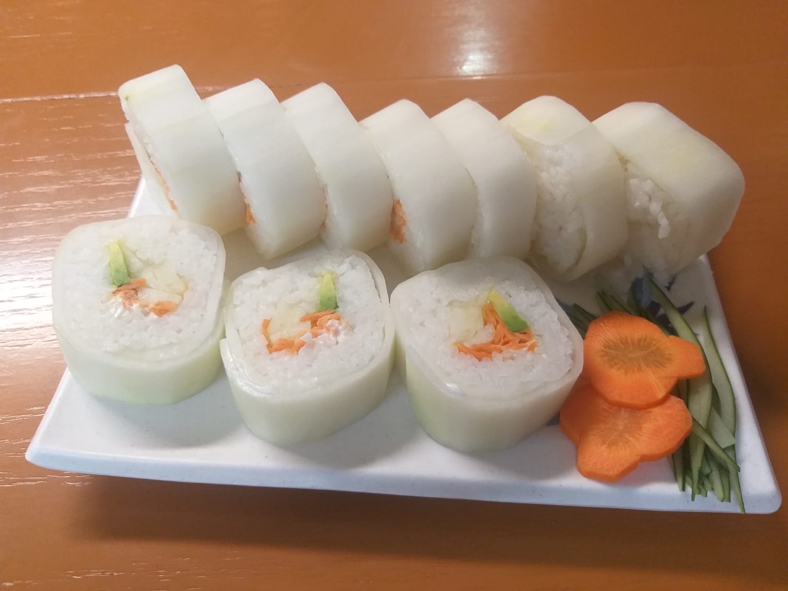 Philadelphia, aguacate, pepino y zanahoria por dentro, surimi por fuera.