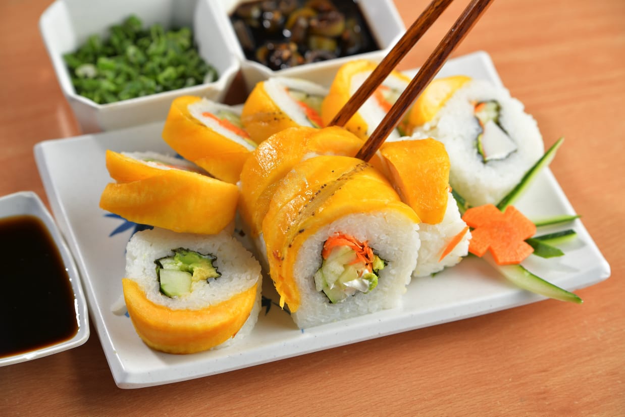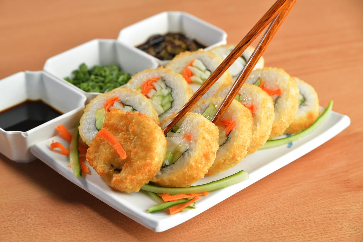 Philadelphia, aguacate, pepino y zanahoria por dentro, empanizado por fuera.