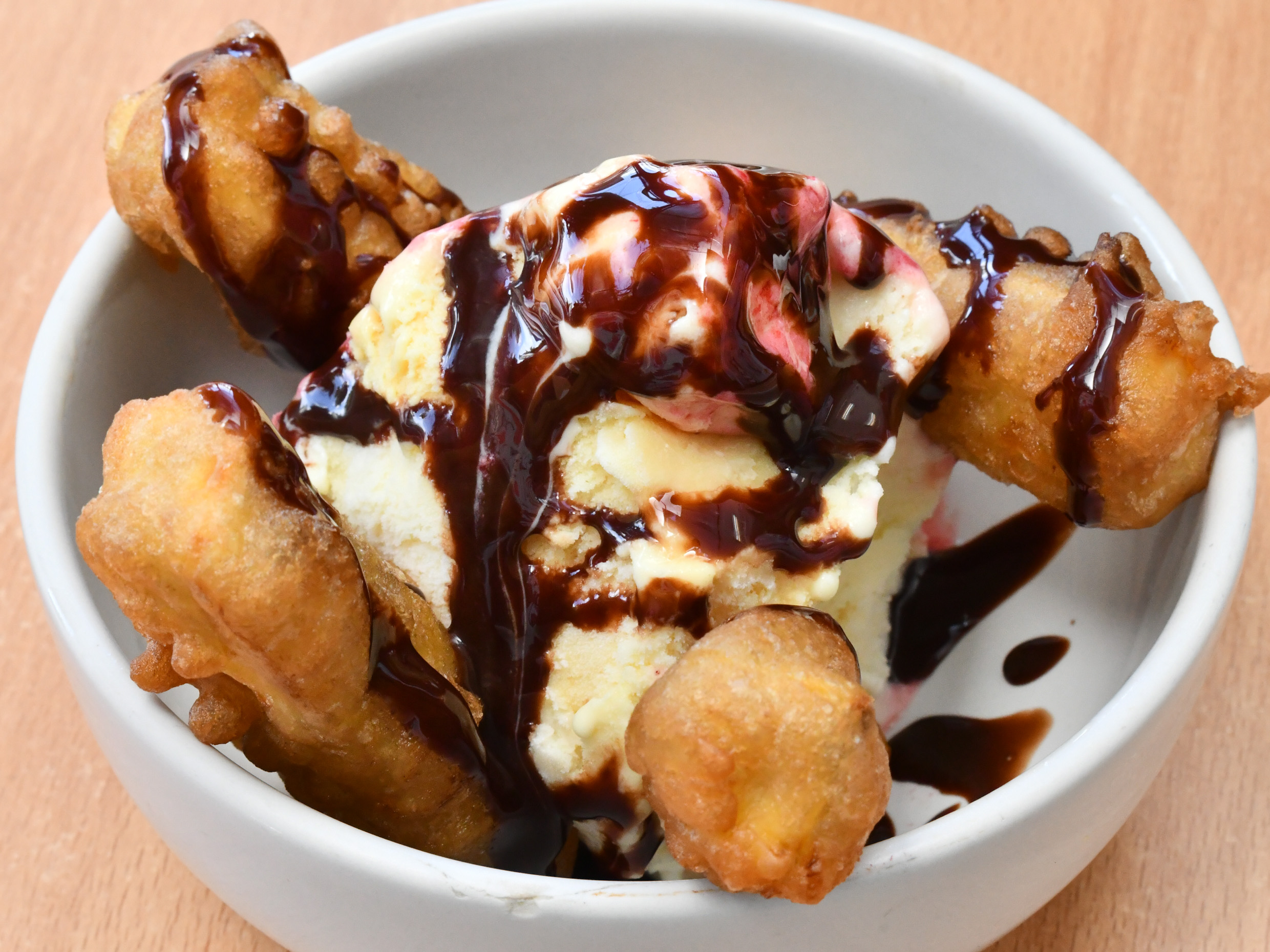 Helado de vainilla y plátano macho capeado, opción a elegir chocolate o mermelada.