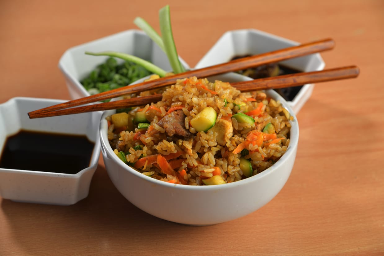 Arroz frito con pollo, res, zanahoria y calabaza.