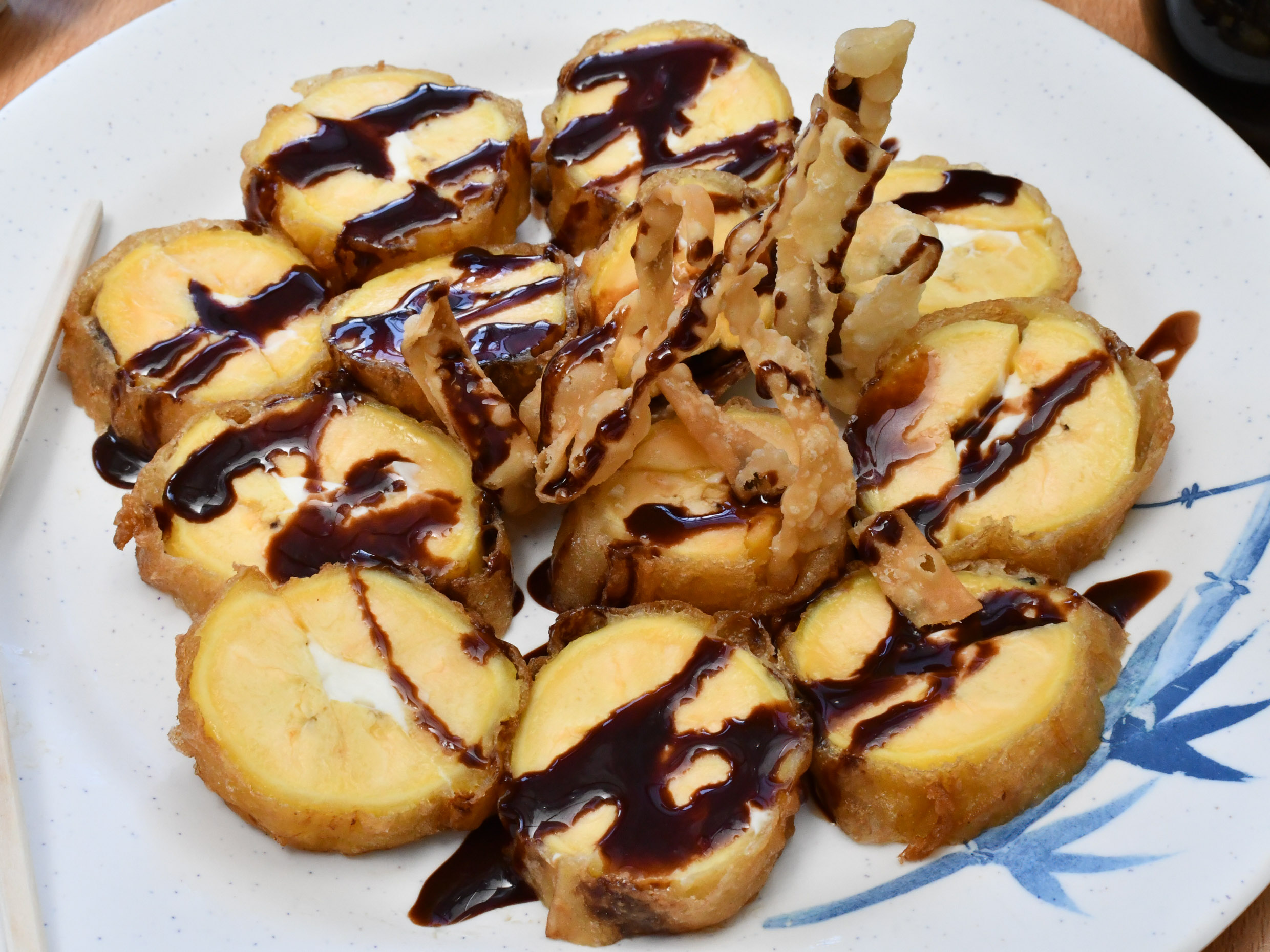 Bola de arroz rellena de queso filadelfia con proteína a elegir, bañados con aderezo y salsa de anguila.