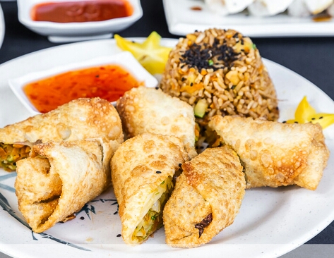 3 pzas de rollo primavera relleno de queso Philadelphia y camarón acompañado de arroz frito y una salsa especial