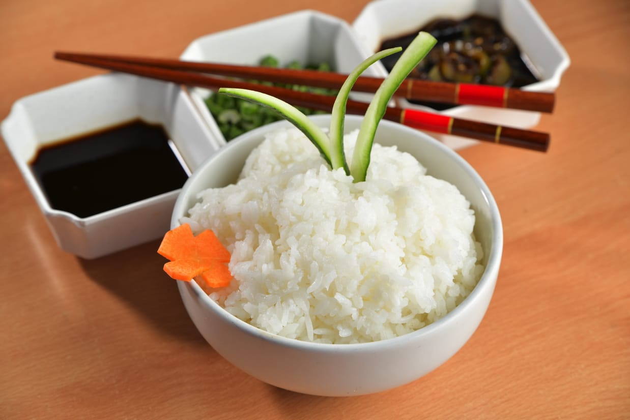 3 piezas de rollo rellenos de verdura, acompañados de una una porción de arroz frito.