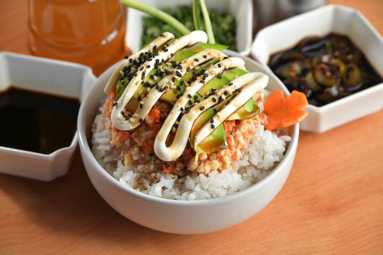 Acompañado con ensalada de surimi, aguacate, filadelfia, salsa de angila y furikake. para un apersona