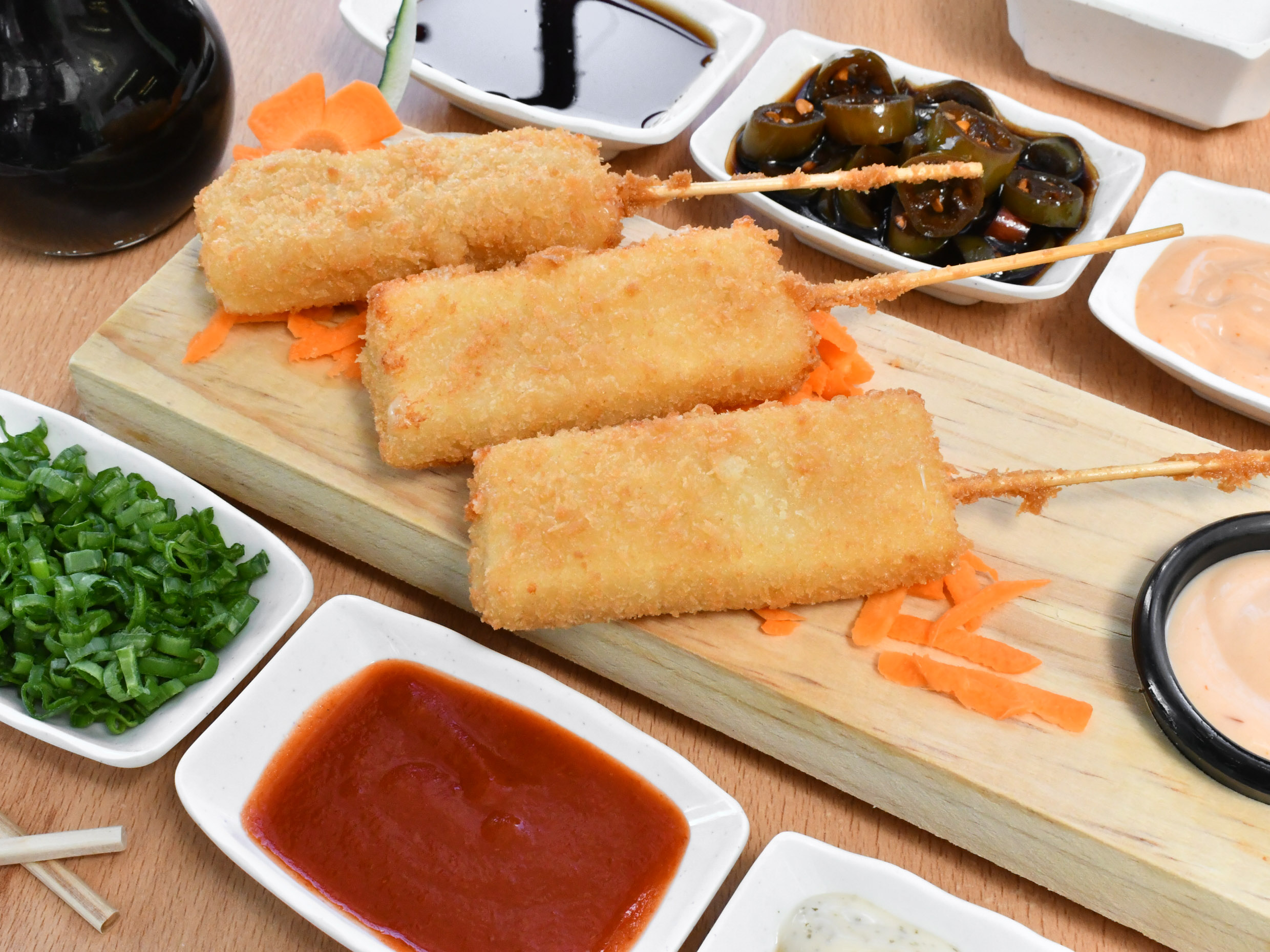 Philadelphia, aguacate, pepino y zanahoria por dentro, empanizado por fuera y queso philadelphia, manchego y amarillo.