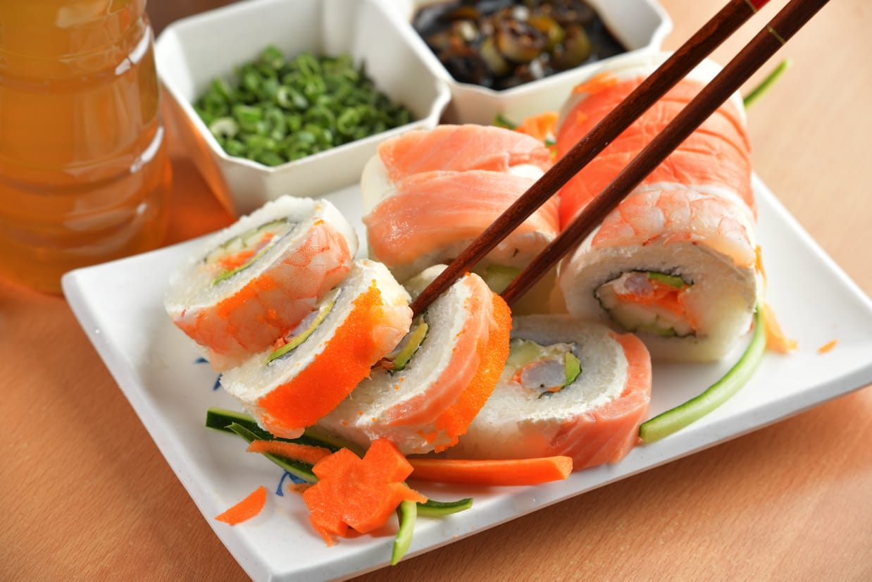 Philadelphia, aguacate, pepino y zanahoria por dentro, salmón por fuera.