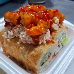 sushi empanizado,relleno de pepino,filadelphia,y proteina a elegir cubierto de toping de tampico y camarones a la diabla