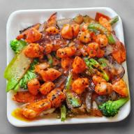 Zanahoria, brócoli, cebolla, chile morrón y calabaza bañadas en salsas agridulces con una cama de arroz blanco y camarones a la diabla.