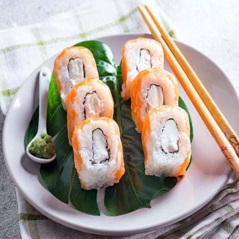 Sushi con alga por fuera, relleno de Philadelphia, pepino y camarón, cubierto de tampico y zanahoria.