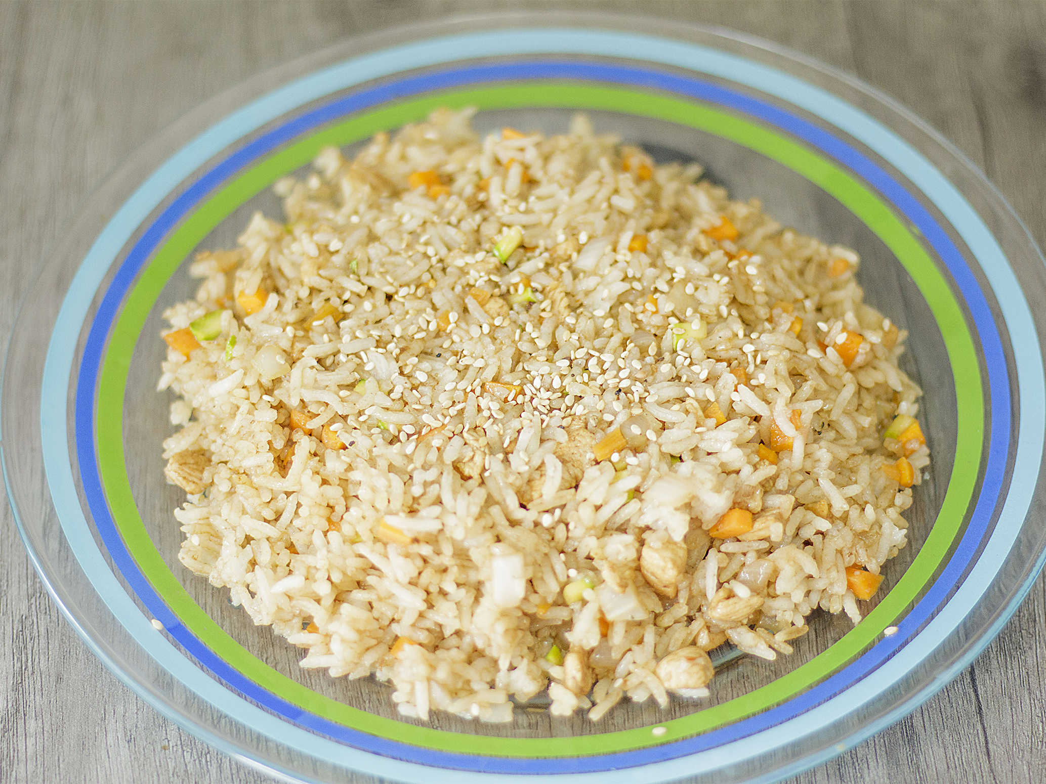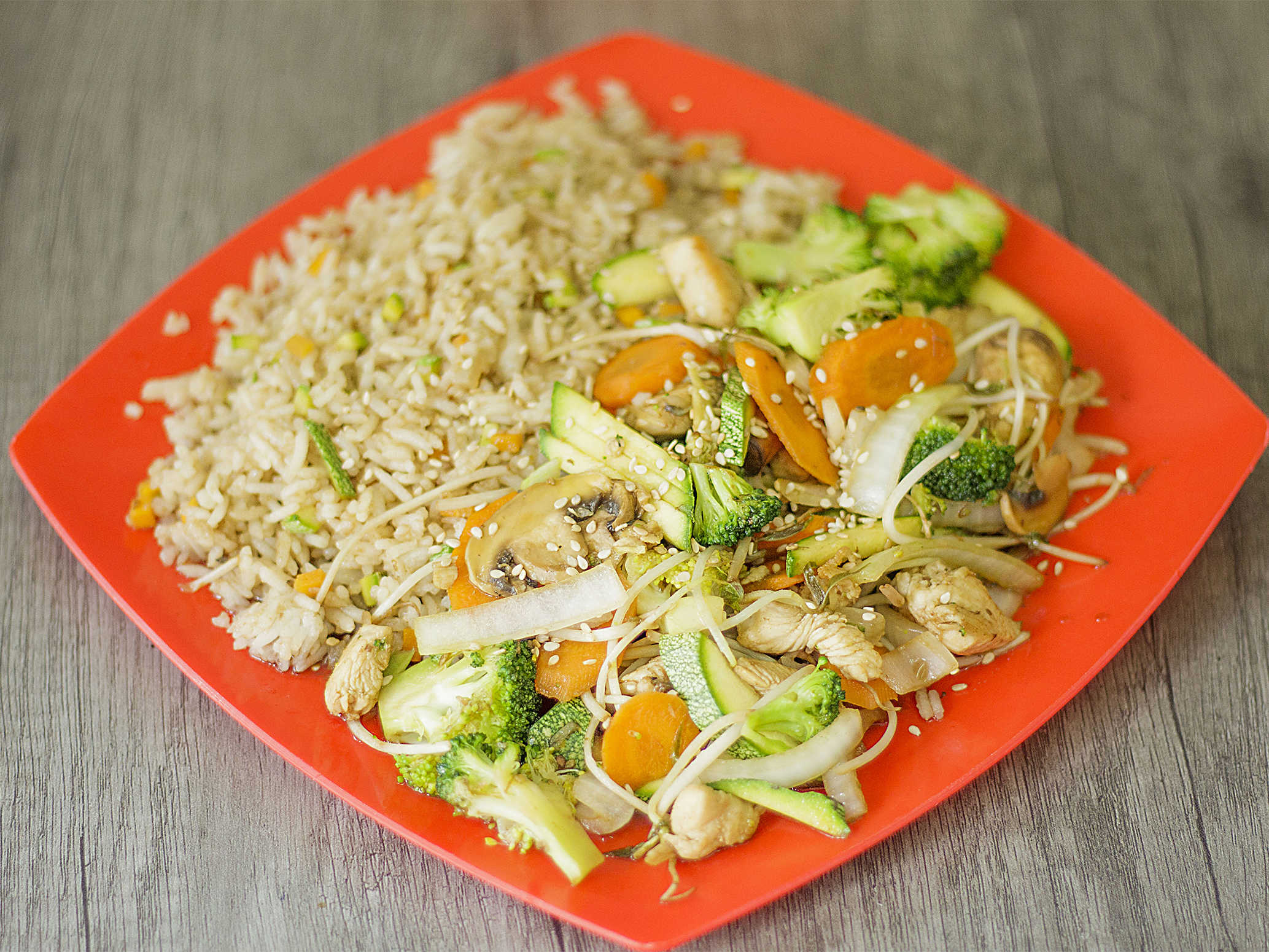 Brócoli, zanahoria, calabaza, cebolla, champiñón y germen de soya acompañado con arroz frito