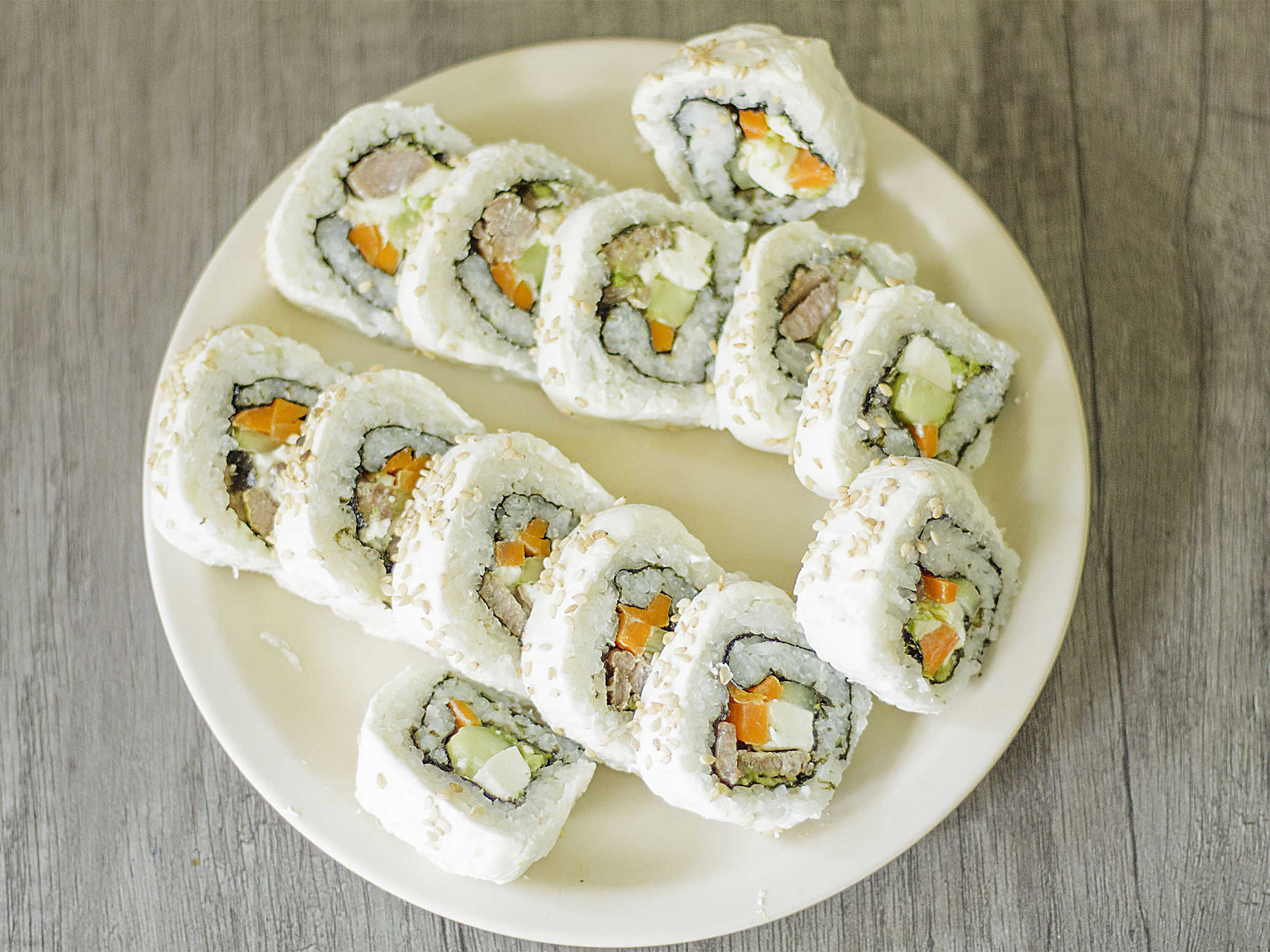 Cubierto de philadelphia por fuera incluye, philadelphia, zanahoria, pepino y aguacate por dentro. Elige una Carne de tu preferencia.